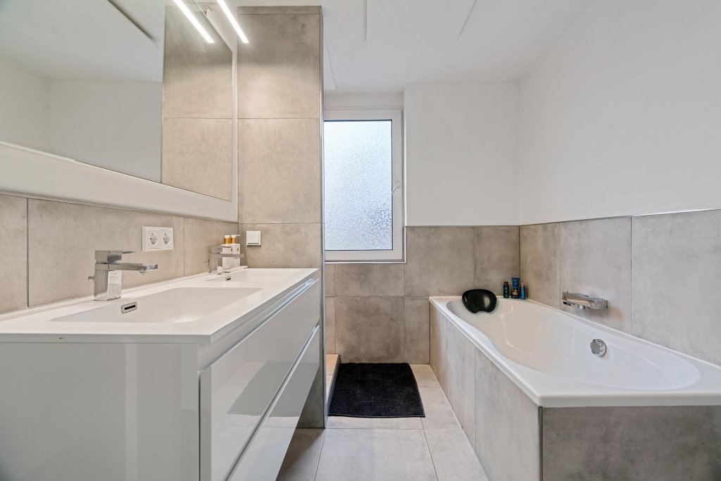 Op de eerste verdieping vindt u drie ruime slaapkamers, allen met grindvloer en handmatige rolluiken. De slaapkamer aan de achterzijde beschikt over een airco voor aangenaam comfort. De luxe betegelde badkamer is voorzien van een ligbad, toilet, inloopdouche en een dubbele wastafel met meubel. Vanuit de overloop is tevens de vaste trap naar de tweede verdieping bereikbaar.