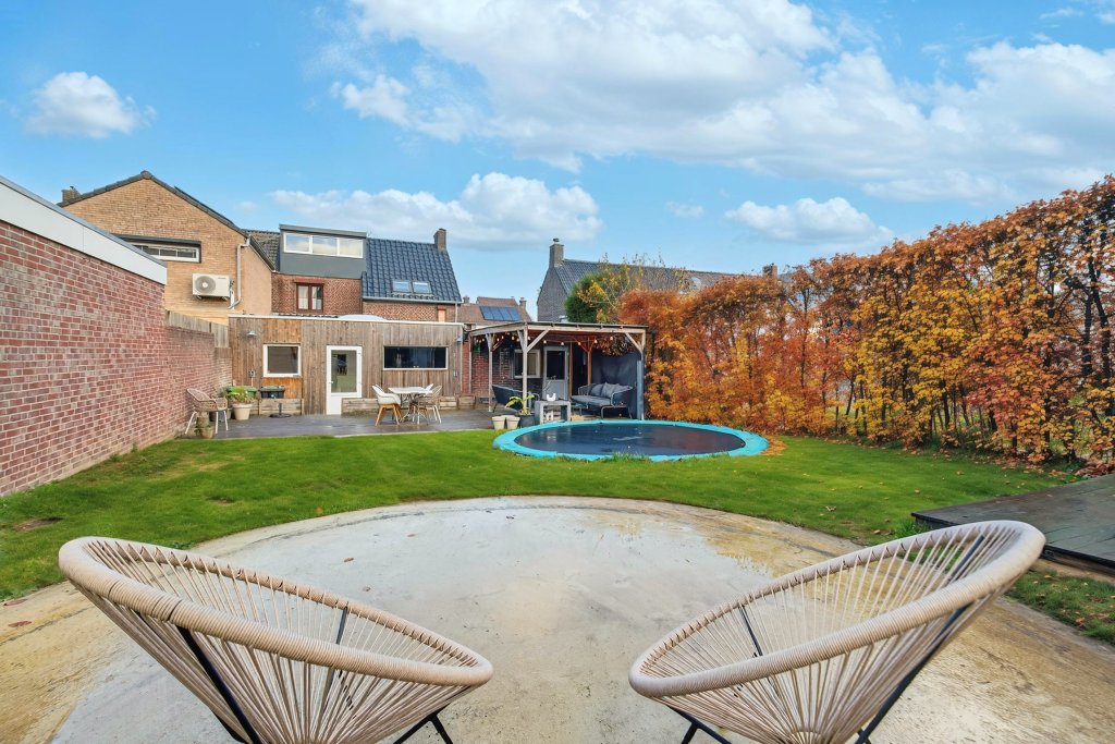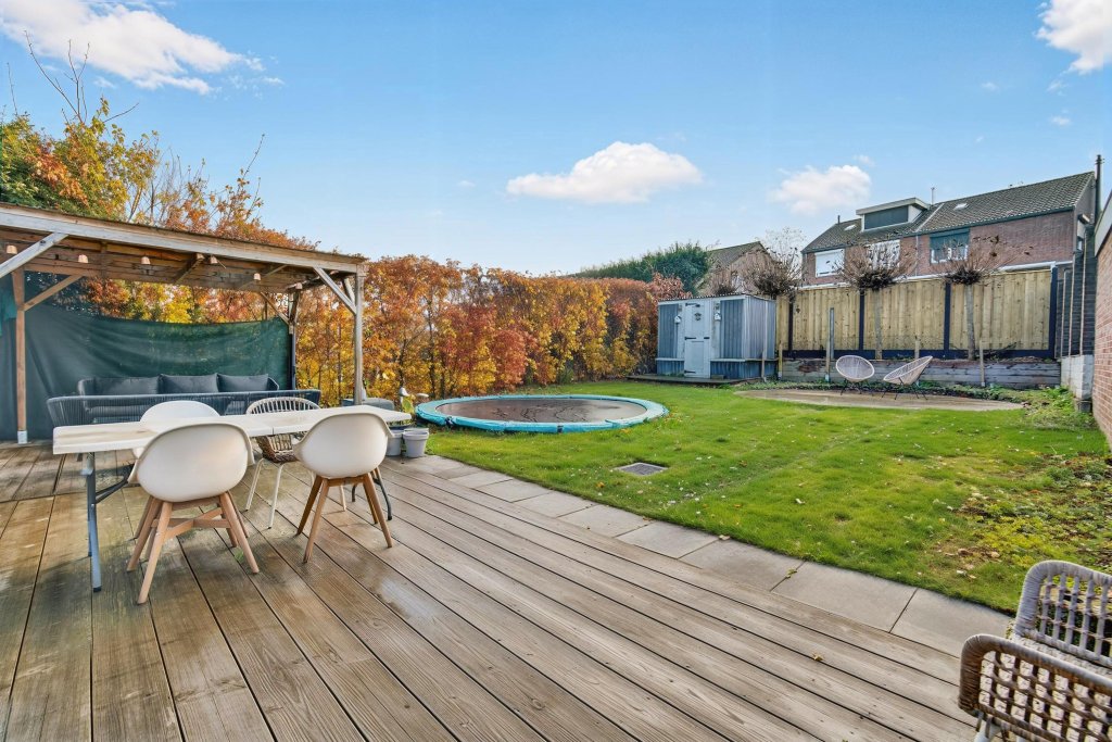 De royale achtertuin is veelzijdig ingedeeld en biedt volop mogelijkheden om te ontspannen of te spelen. Direct achter de woning ligt een betegeld terras, gevolgd door een loungegedeelte met houten overkapping. Achterin de tuin bevindt zich een groen gedeelte met een schuurtje, ideaal voor opslag of als praktische werkruimte. Via de tuin is er bovendien directe toegang tot de garage, wat het geheel zeer functioneel maakt.