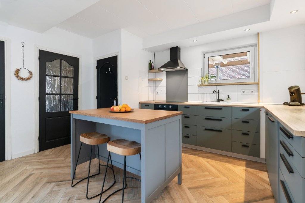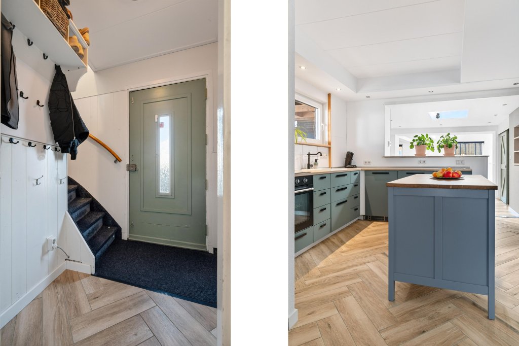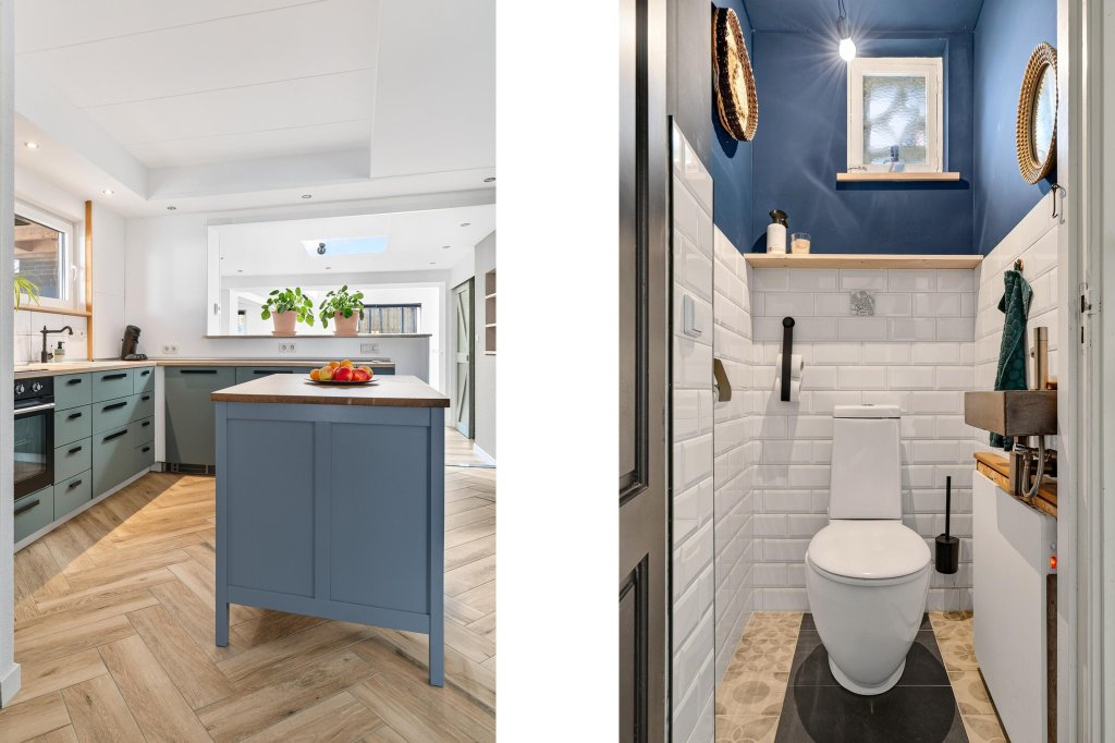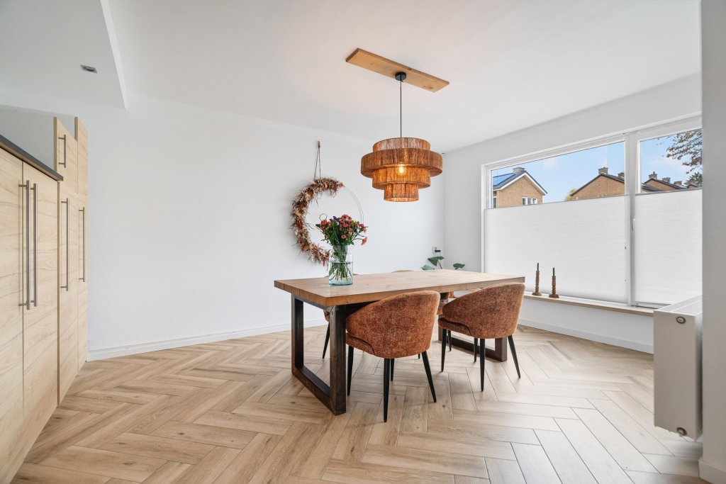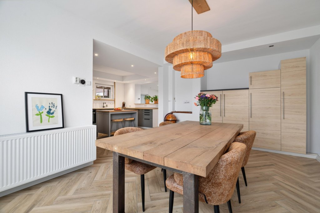 De keuken is modern en praktisch ingericht, met een 4-pits inductieplaat, oven, afzuigkap, vaatwasser en spoelbak. Vanuit de keuken zijn meerdere functionele ruimtes bereikbaar, zoals de bijruimte met koel- en vriesaansluiting, de wasruimte met aansluiting voor de wasmachine en toegang tot de kelder. De keuken staat in open verbinding met de eetkamer, die dankzij het grote raam veel natuurlijke lichtinval ontvangt, en via een klein afstapje met de ruime woonkamer in de aanbouw.