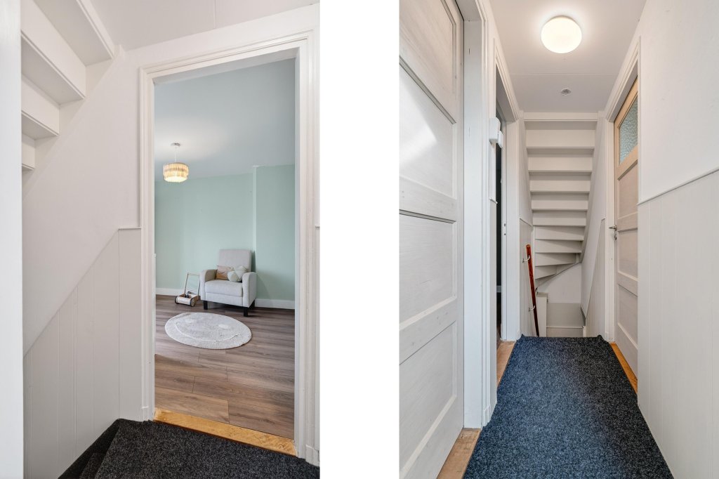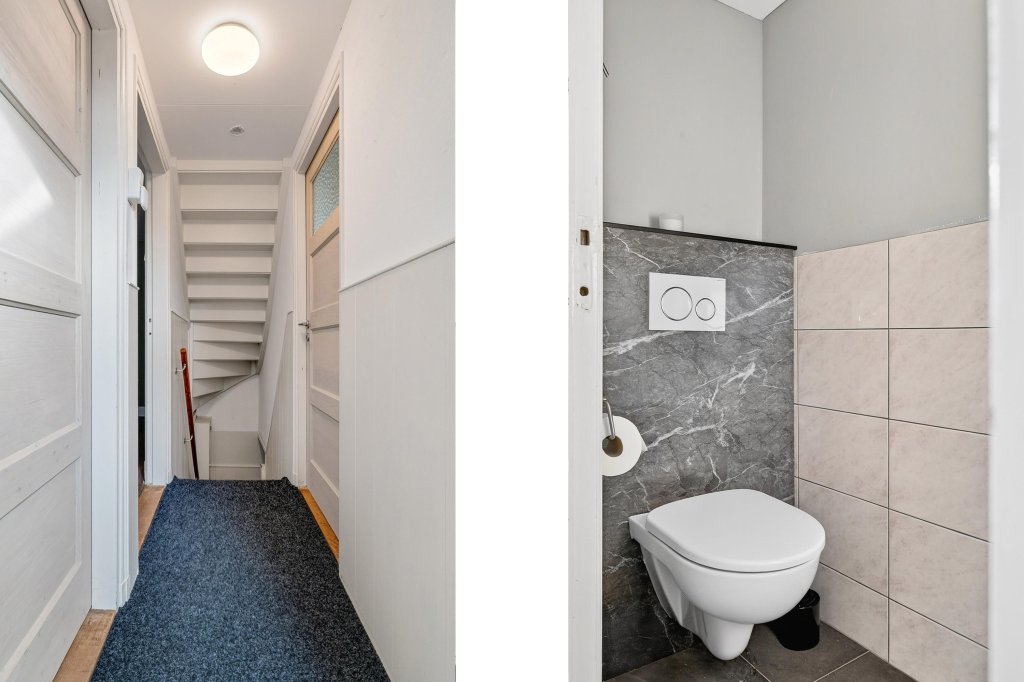 Bij binnenkomst treft u de hal met garderobe en een apart, half betegeld toilet met fonteintje. De hal biedt toegang tot de keuken en de vaste trap naar de eerste verdieping, en vormt zo het centrale hart van de woning.