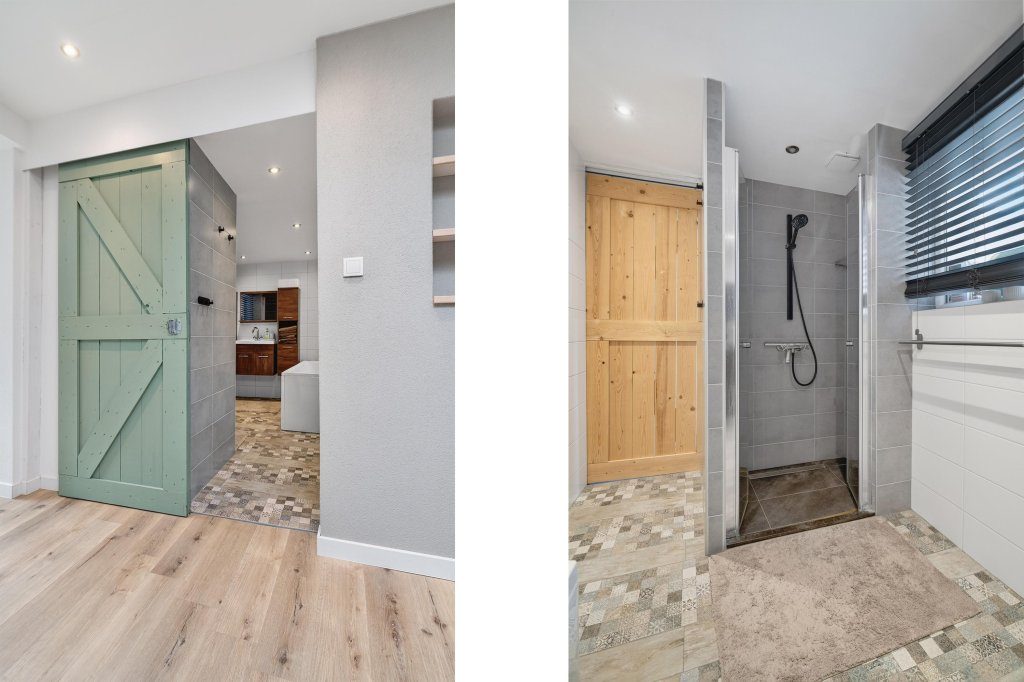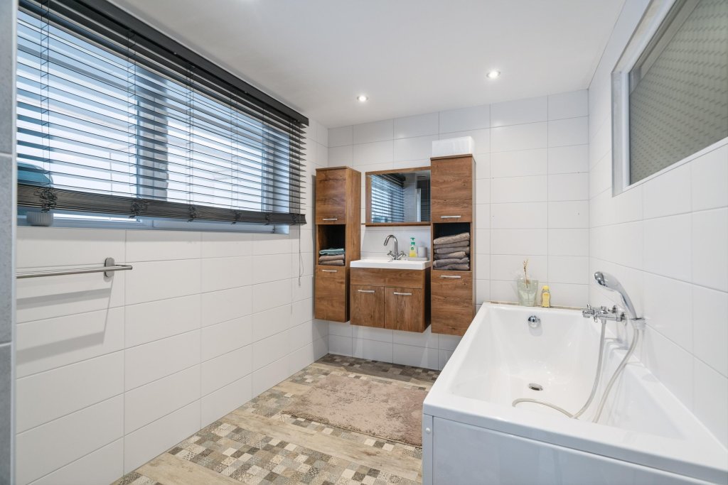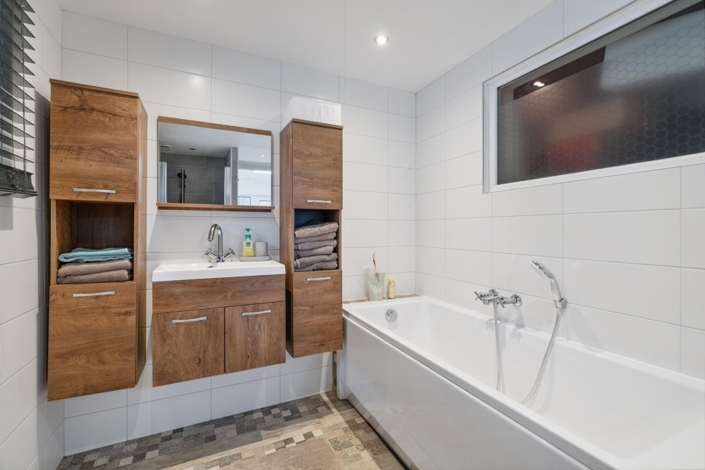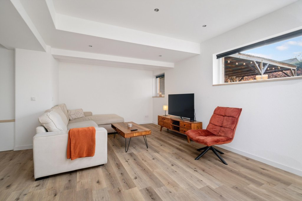 De woonkamer is sfeervol en voorzien van laminaatvloer en airco. Vanuit de woonkamer is de volledig betegelde badkamer bereikbaar, uitgerust met een ligbad, inloopdouche en wastafel met meubel. Daarnaast is er via de woonkamer directe toegang tot de tuin en de oprit, waardoor binnen en buiten naadloos in elkaar overlopen.