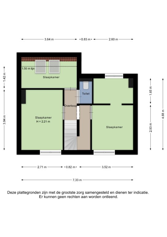 - Slaapkamer 1 (achterzijde): ca. 5m², met twee dakramen die veel lichtinval bieden.