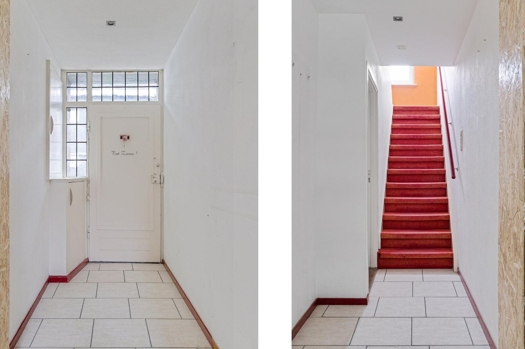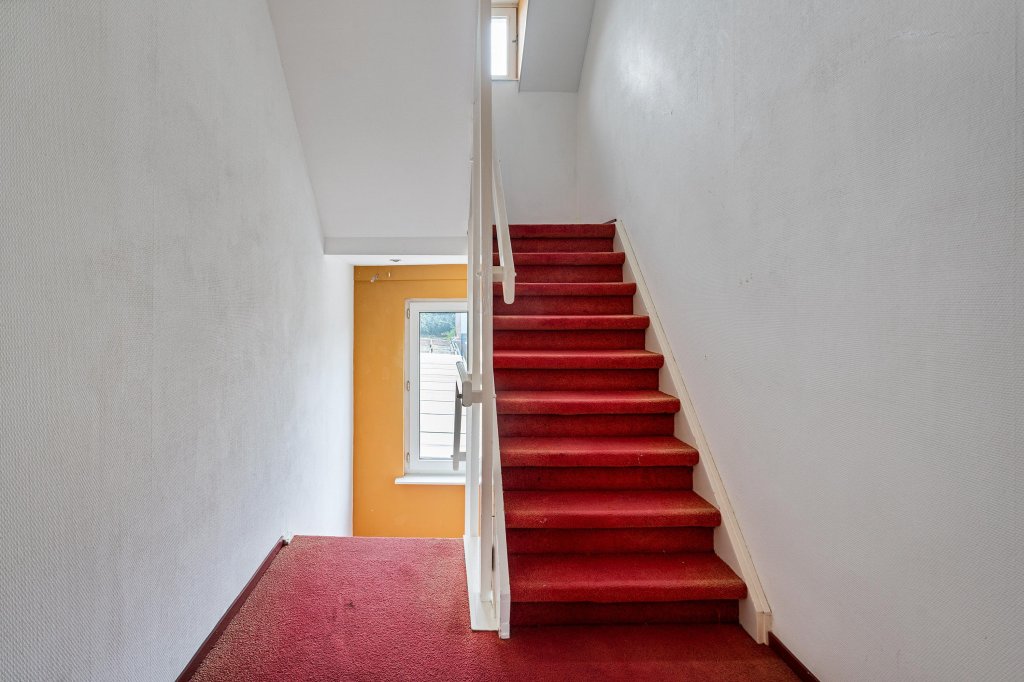 De trap naar de tweede verdieping heeft een bordes met dakraam, wat zorgt voor extra lichtinval. Vanaf de overloop zijn twee slaapkamers en een muurkast bereikbaar.