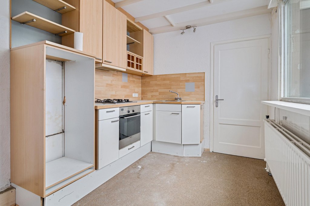 De trap met bordes en raam leidt naar de eerste verdieping. Hier kom je op een overloop die toegang biedt tot een royale woonruimte met open keuken en trap naar de tweede verdieping. De keuken is voorzien van een 4-pits fornuis, afzuigkap, combi-magnetron/oven, koelkast, spoelbak en boven- en onderkasten.