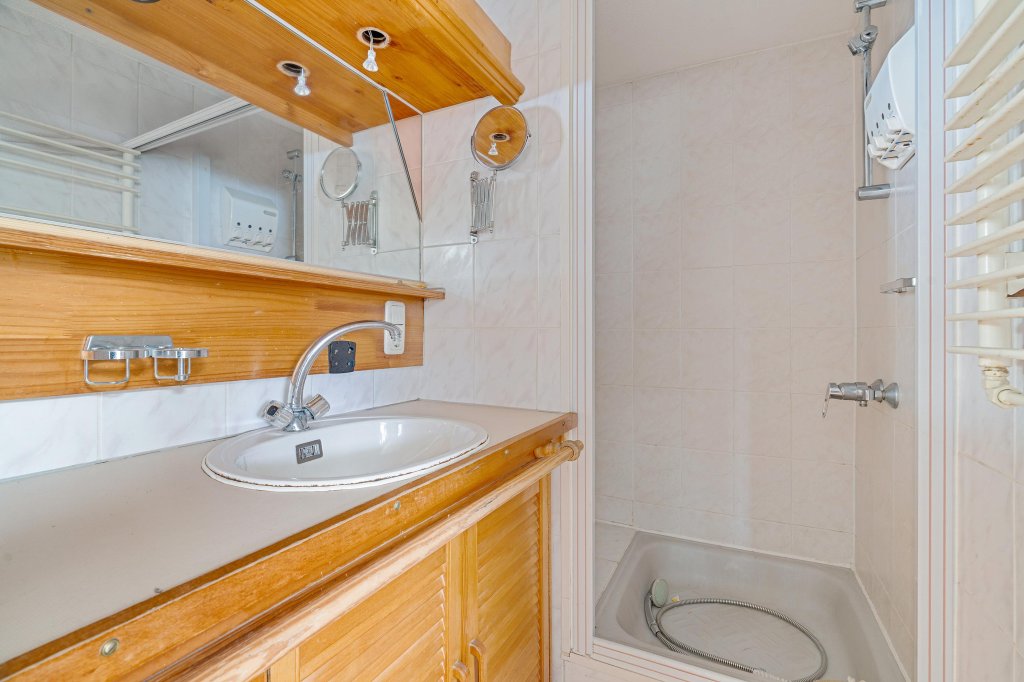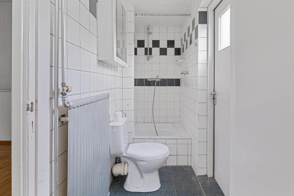De badkamer is praktisch ingedeeld met een aparte toiletruimte met wastafel, een douche en een wastafelmeubel met kasten. Ook vanuit de badkamer is de serre bereikbaar.