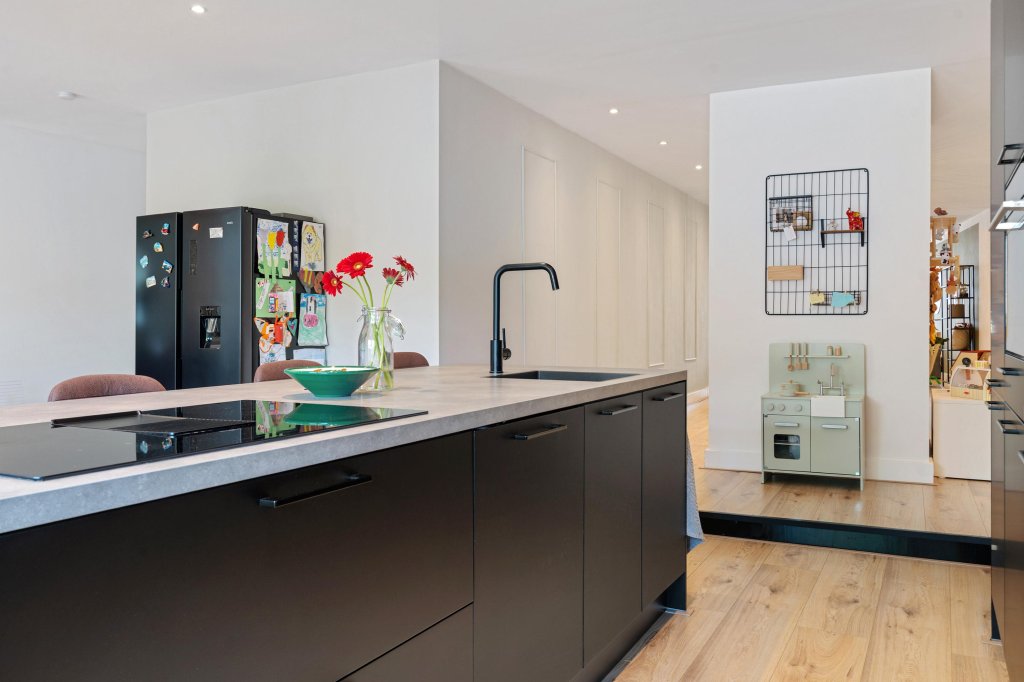 Bij binnenkomst in de ruime hal met meterkast en toegang tot de riante living. De sfeervolle living is voorzien van nette laminaat en ingedeeld in een zit- en eetgedeelte. De trap naar de eerste verdieping is stijlvol geïntegreerd in de ruimte. Aansluitend vind je de moderne open keuken met kookeiland welke is voorzien van de navolgende apparatuur: 4 pits inductiekookplaat met geïntegreerde afzuiging, combi-oven en vaatwasser. Via de openslaande tuindeuren heb je direct toegang tot de tuin. Een lange verkeersruimte verbindt de keuken met meerdere functionele vertrekken: