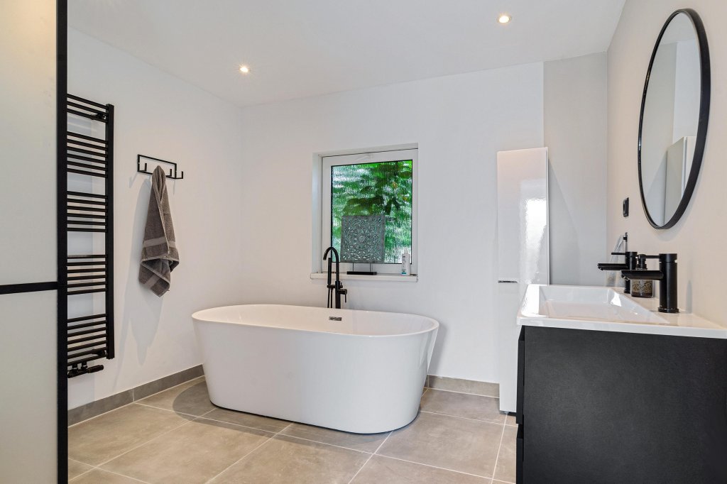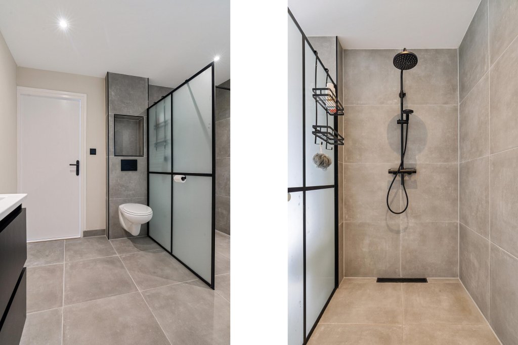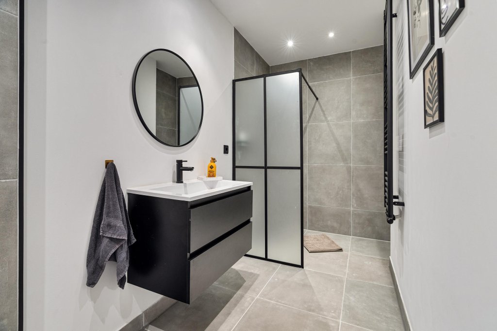 - Een moderne badkamer (ca. 6m²) uit 2022 met een inloopdouche, zwevend toilet, wastafel met meubel en designradiator
