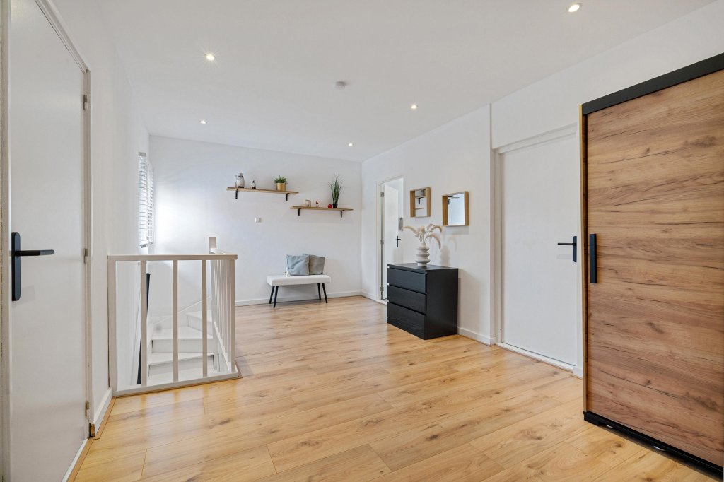 Via de ruime overloop bereik je drie slaapkamers, de tweede badkamer en het dakterras: