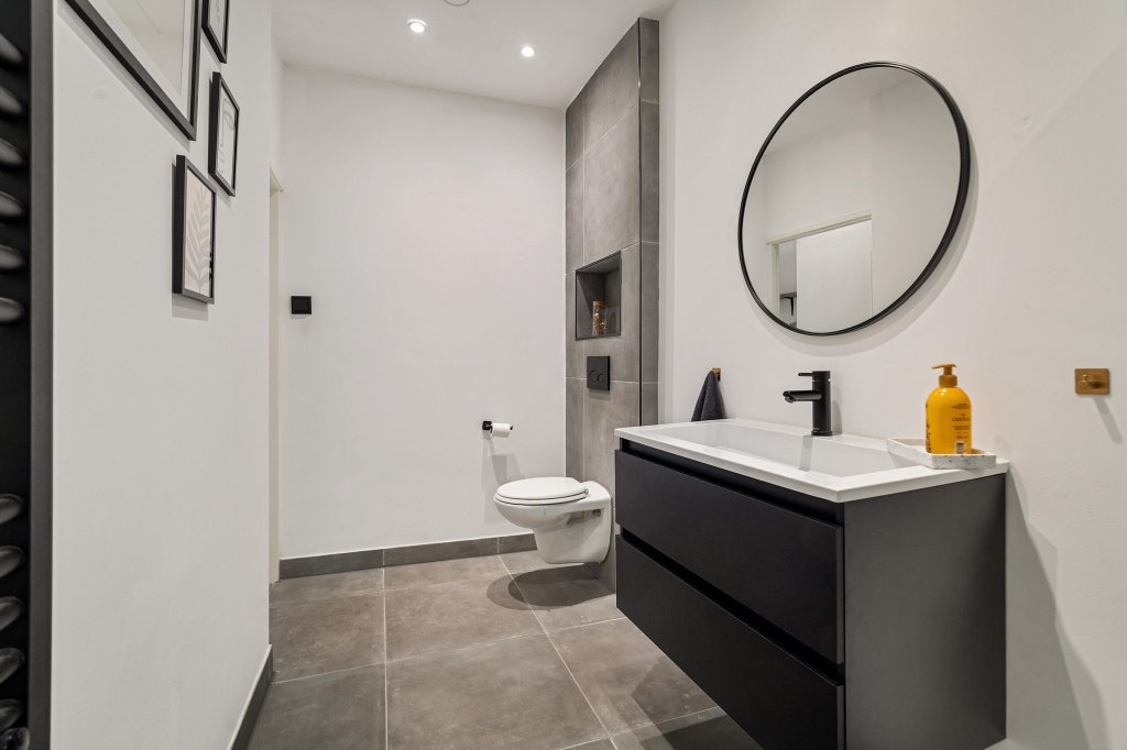 De moderne badkamer is voorzien van inloopdouche, ligbad, zwevend toilet en wastafel met meubel.