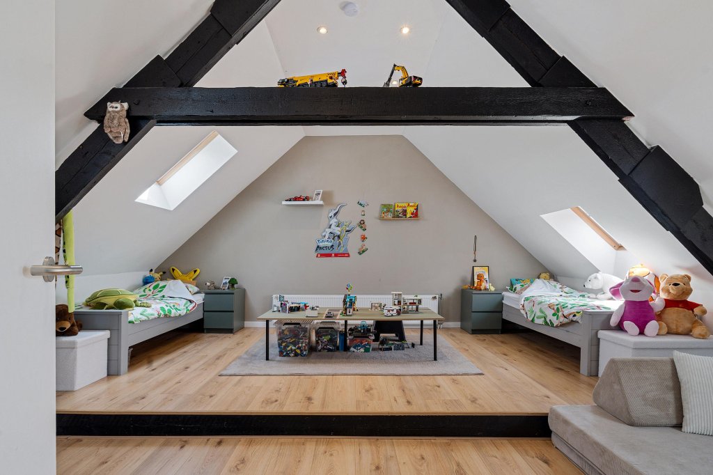 Via een vaste trap bereik je de verrassend ruime zolderverdieping met de vierde slaapkamer (ca. 29m²). Deze kamer is eveneens afgewerkt met een laminaatvloer en voorzien van meerdere dakramen aan zowel de voor- als achterzijde, wat zorgt voor een prettige lichtinval. Dankzij de afmetingen en indeling is deze ruimte ideaal als extra slaapkamer, hobbyruimte of werkplek aan huis.