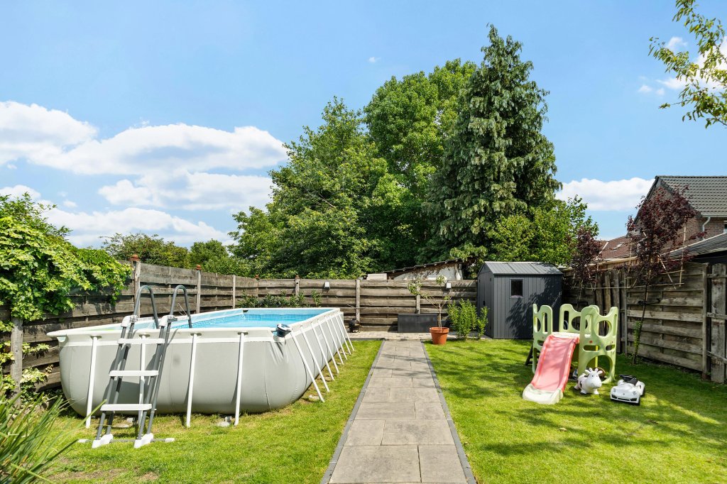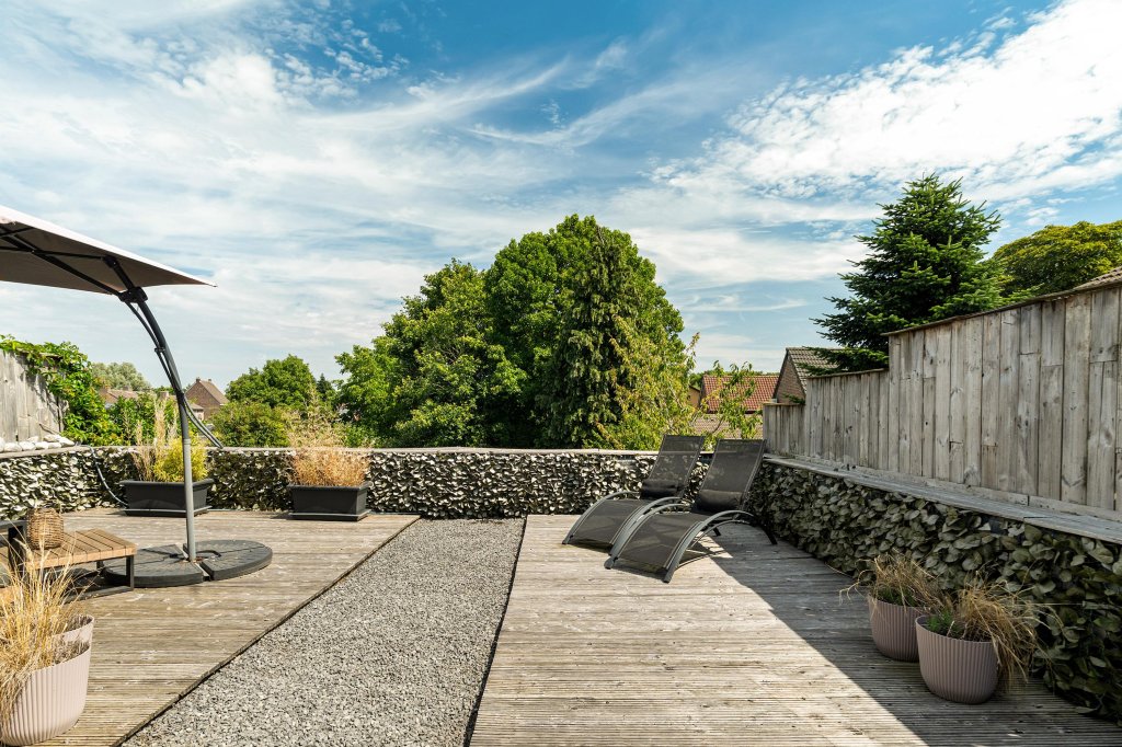 De fraai aangelegde achtertuin is geheel omsloten en biedt dankzij de ligging en indeling optimale privacy. De tuin is ingericht met een terras, gazon, borders en een kunststof berging.