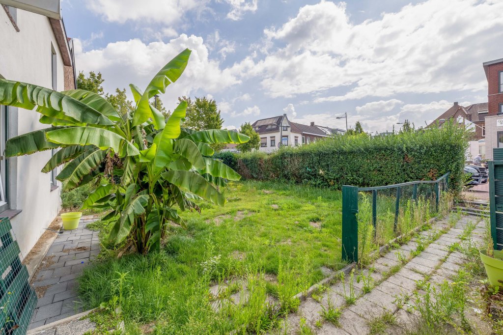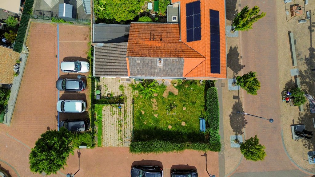 Aan de voorzijde van de woning ligt een royaal gazon met terras en borders. Naast de woning is een overdekt gedeelte, ideaal voor het stallen van fietsen of opslag. De woning beschikt bovendien over een eigen parkeerplaats op eigen terrein.