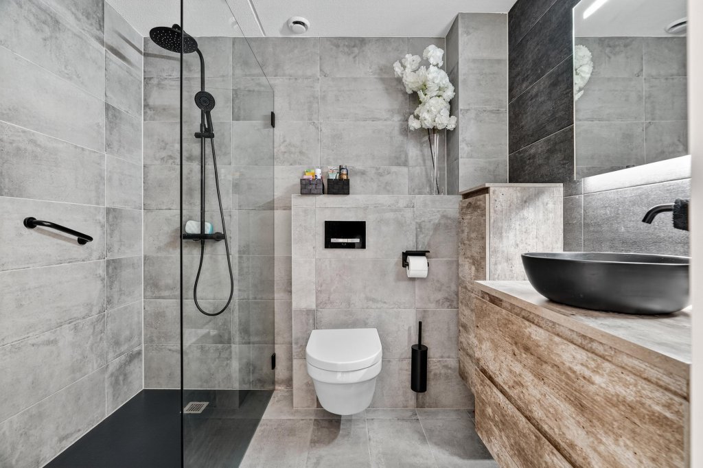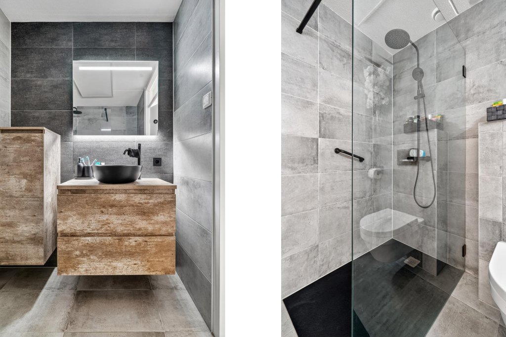 De volledig betegelde, luxe afgewerkte badkamer is een echte blikvanger. Deze beschikt over een moderne wastafel met kraan, een ruime inloopdouche die stijlvol wordt afgescheiden door een glazen wand, en een zwevend toilet. Een comfortabele en aangename ruimte om de dag fris te beginnen of ontspannen af te sluiten.