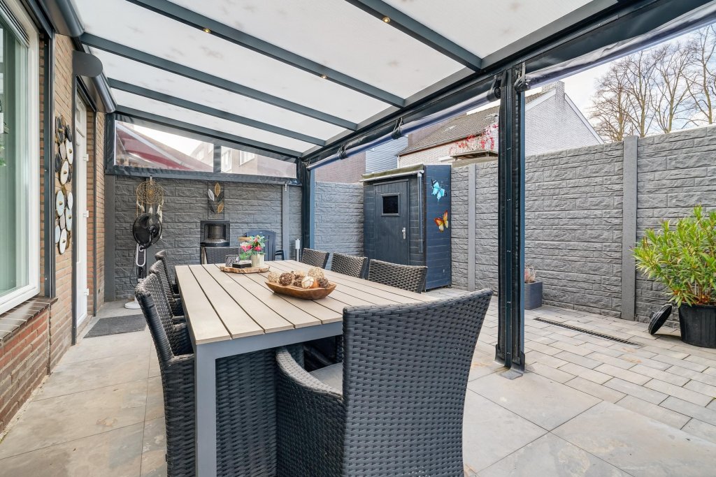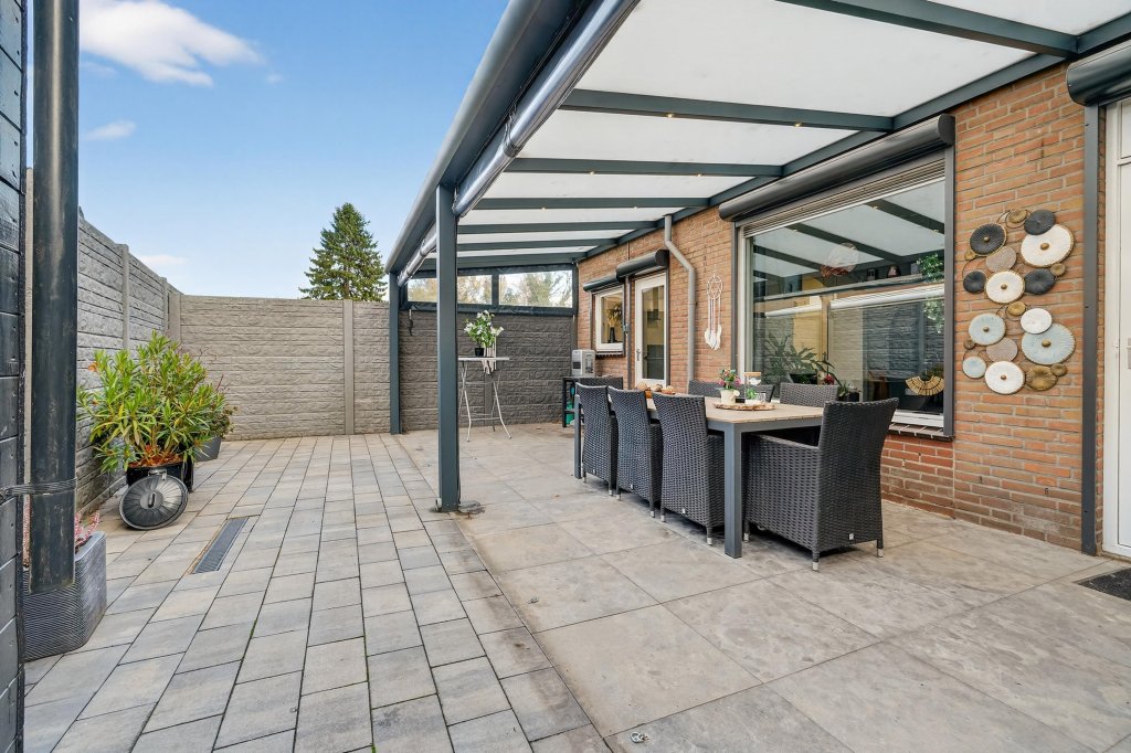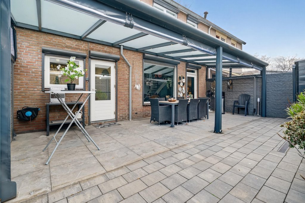 De onderhoudsvrije, geheel beklinkerde achtertuin is een heerlijke plek om buiten te genieten. Over de volledige breedte van de woning bevindt zich een royale overkapping met verlichting, waardoor u hier het hele jaar door comfortabel kunt vertoeven — of het nu zonnig, regenachtig of zwoel zomerweer is.