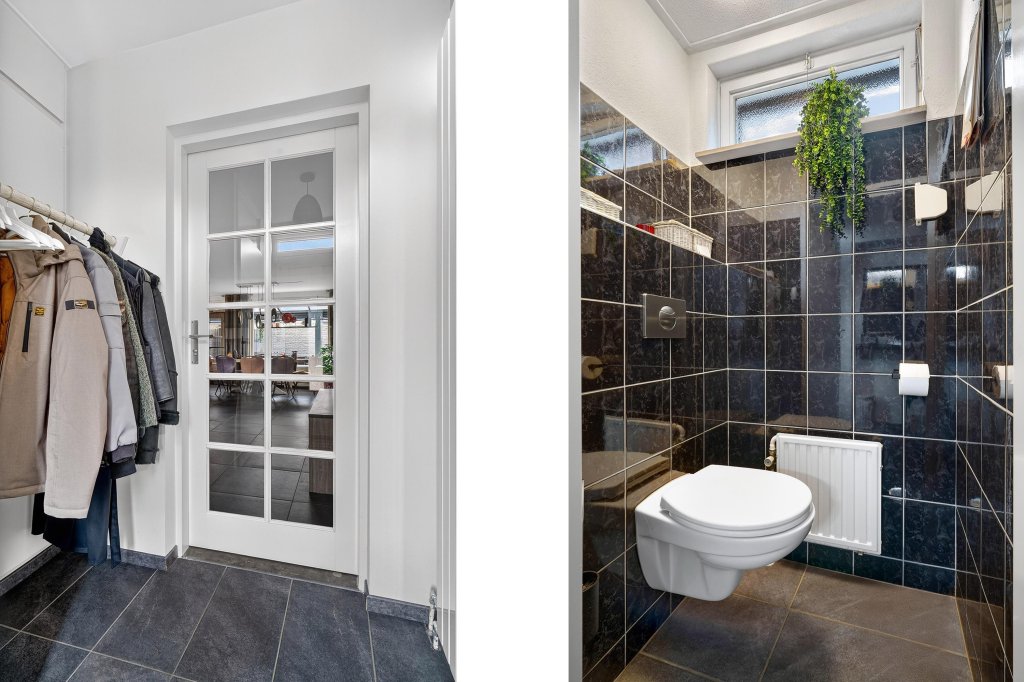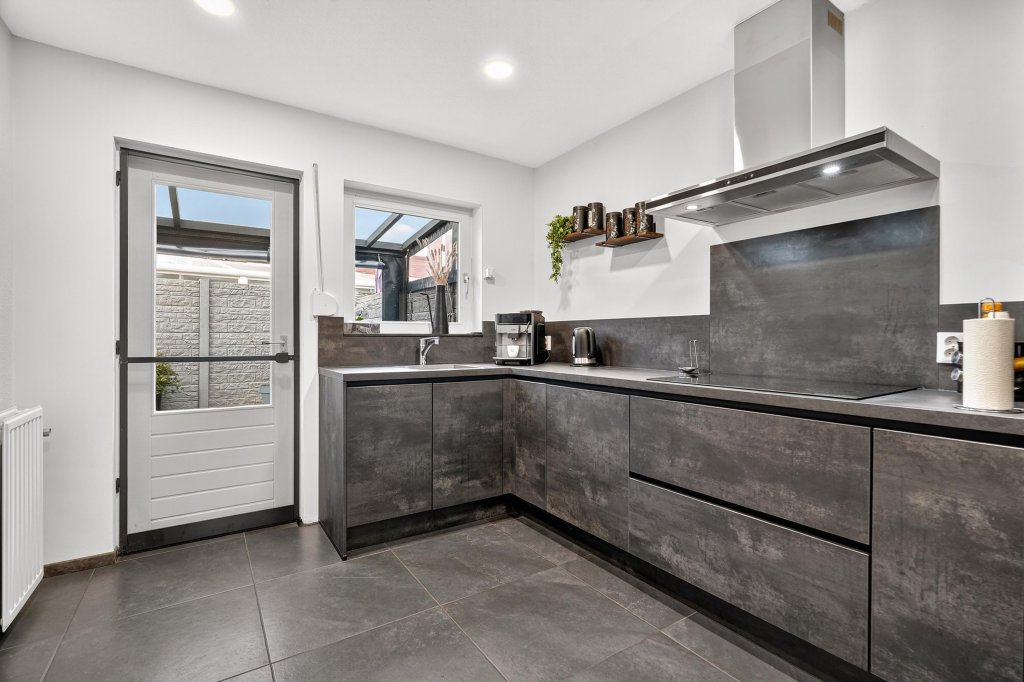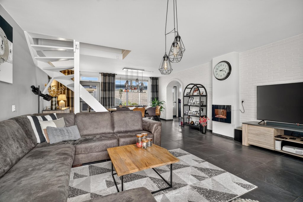 Via de voordeur betreedt u de hal, waar u direct toegang heeft tot de garderobe, de meterkast en de halfhoog betegelde toiletruimte met modern zwevend toilet. Vanuit de hal loopt u de lichte woonkamer binnen, voorzien van een fraaie tegelvloer en een vaste trap naar de eerste verdieping. De woonkamer staat in open verbinding met de luxe ingerichte keuken, wat zorgt voor een ruim en sfeervol geheel.