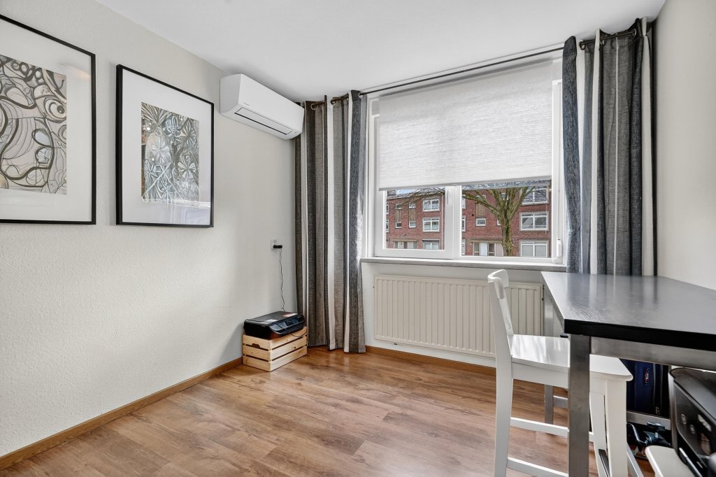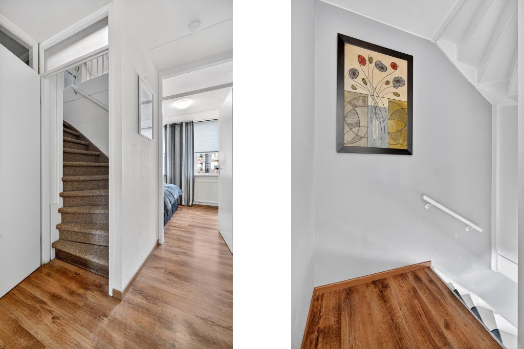 De overloop biedt toegang tot drie keurige slaapkamers en de badkamer. Eén van de slaapkamers is bovendien uitgerust met een eigen airco, ideaal voor extra comfort tijdens warme dagen. De gehele verdieping is afgewerkt met een nette laminaatvloer, wat zorgt voor een strakke en uniforme uitstraling.