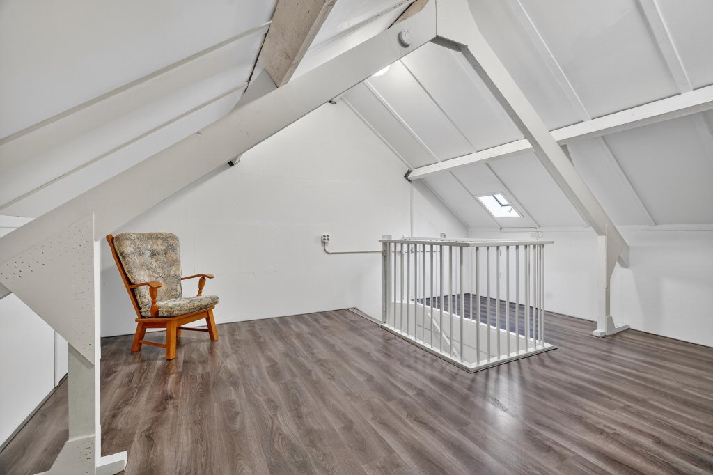 Via een vaste trap bereikt u de zolderverdieping, gelegen onder een schuin dak. Deze royale ruimte biedt volop mogelijkheden dankzij de uitstekende bergruimte. Ideaal als extra opslag, hobbyruimte of een eventuele vierde slaapkamer.