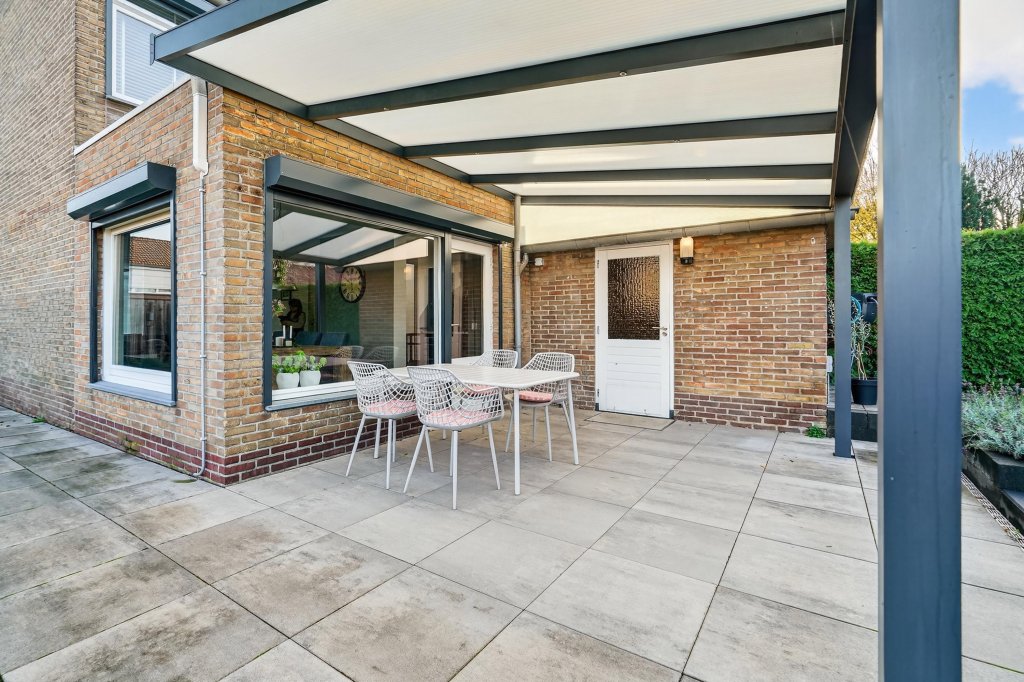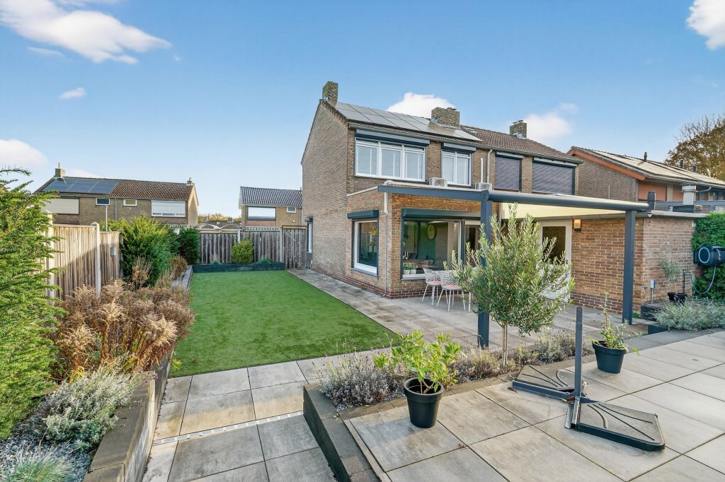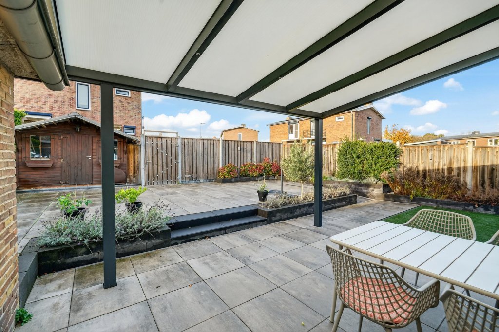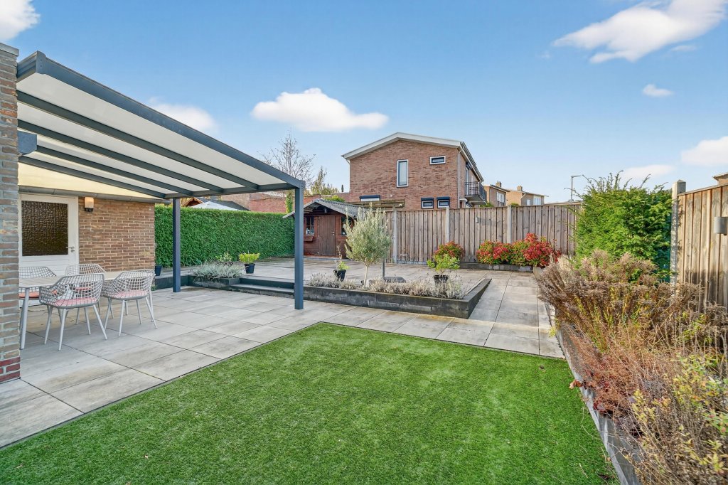 De fraai aangelegde voor- en achtertuin is in 2021 geheel vernieuwd, onderhoudsvriendelijk en beschikt over een eigen oprit, overkapping, terrassen, kunstgras gazon, borders en achteringang.