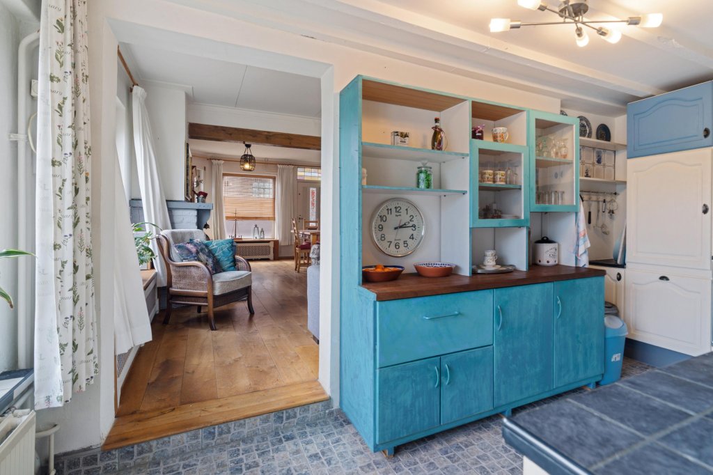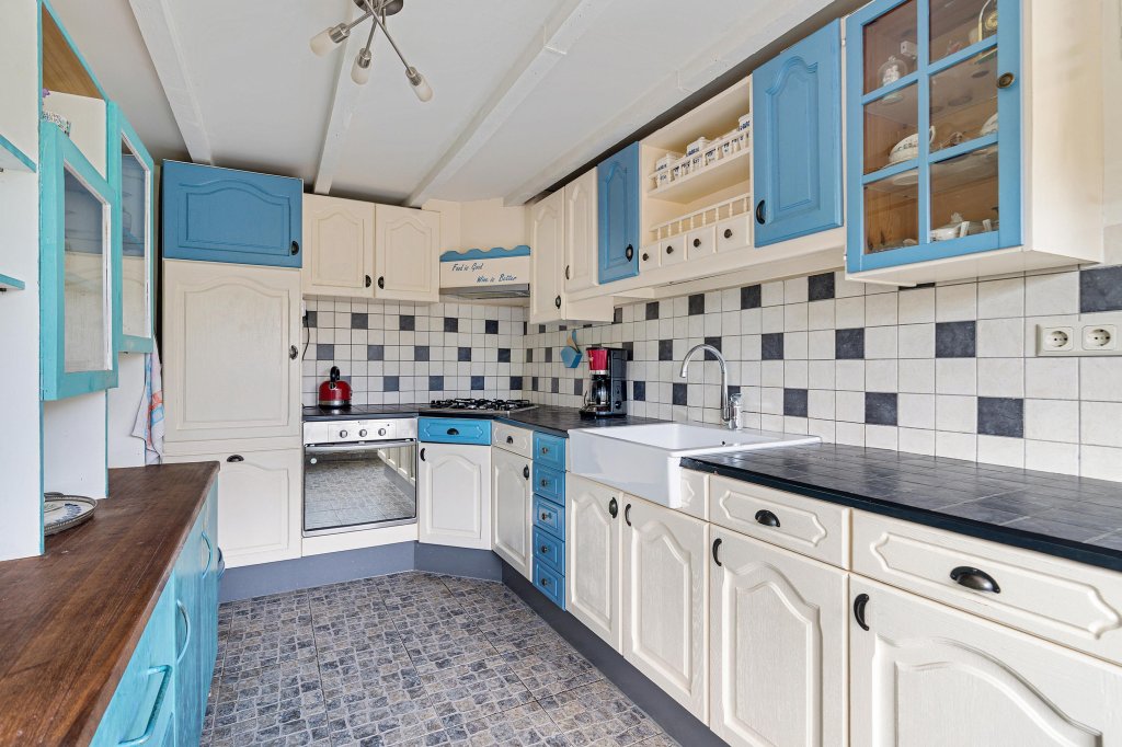 De keuken is praktisch ingericht met boven- en onderkasten, een oven, 4-pits gasfornuis, koelkast en spoelbak. Vanuit de keuken bereik je een tussenruimte die toegang geeft tot de tuin, een kast met cv-ketel en de aansluitingen voor was- en vriesapparatuur. Vanuit deze tussenruimte bereik je tevens het aparte toilet en de serre.