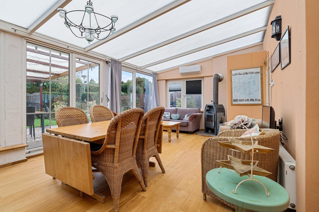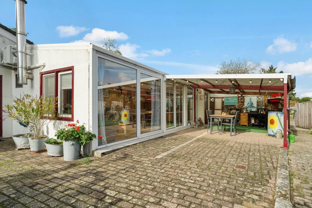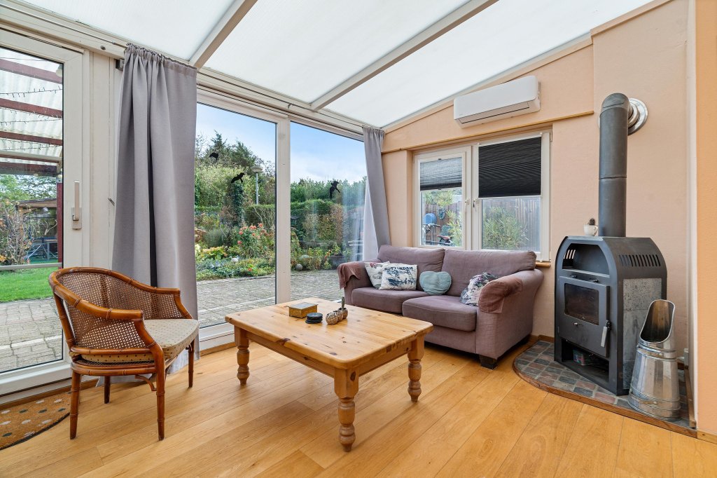 De serre is een heerlijke extra leefruimte met houten vloer, airco en houtkachel. Dankzij de schuifdeur en kiepdeur is de tuin eenvoudig bereikbaar, en via het luik in de vloer bereik je de kelder.