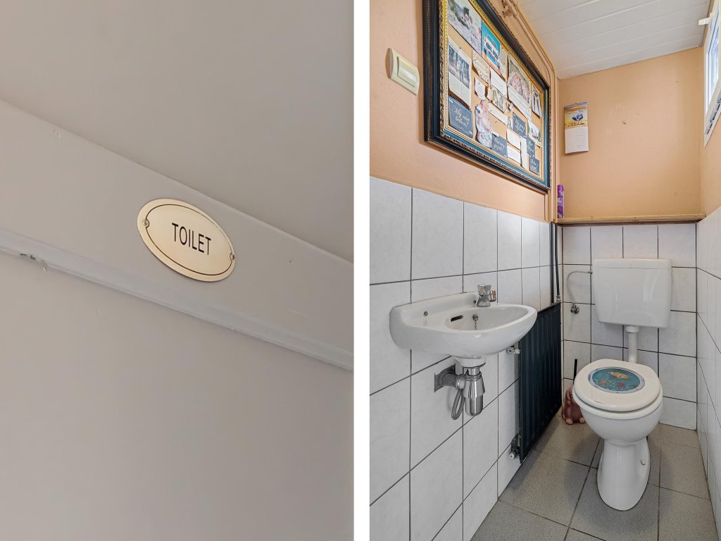Het aparte toilet is half betegeld en voorzien van een fonteintje.
