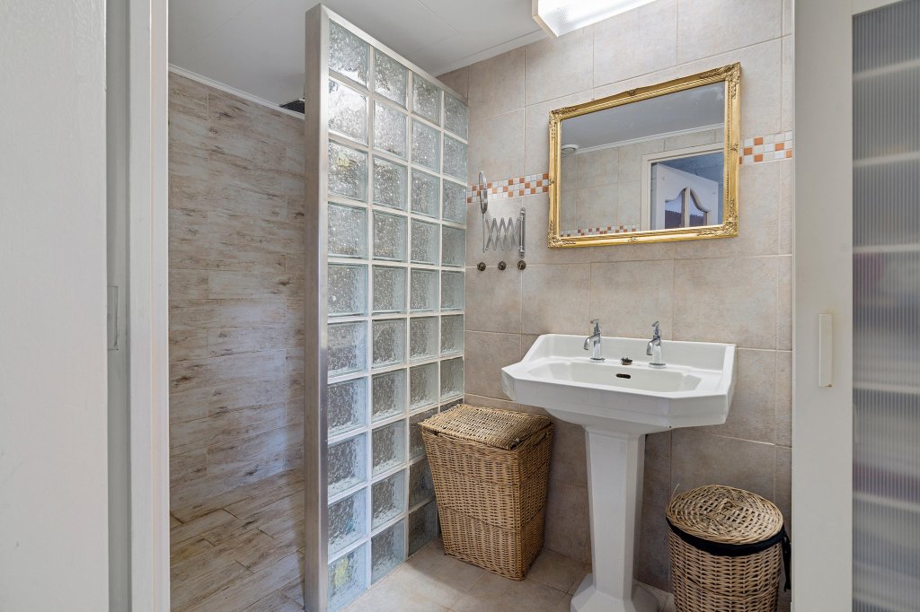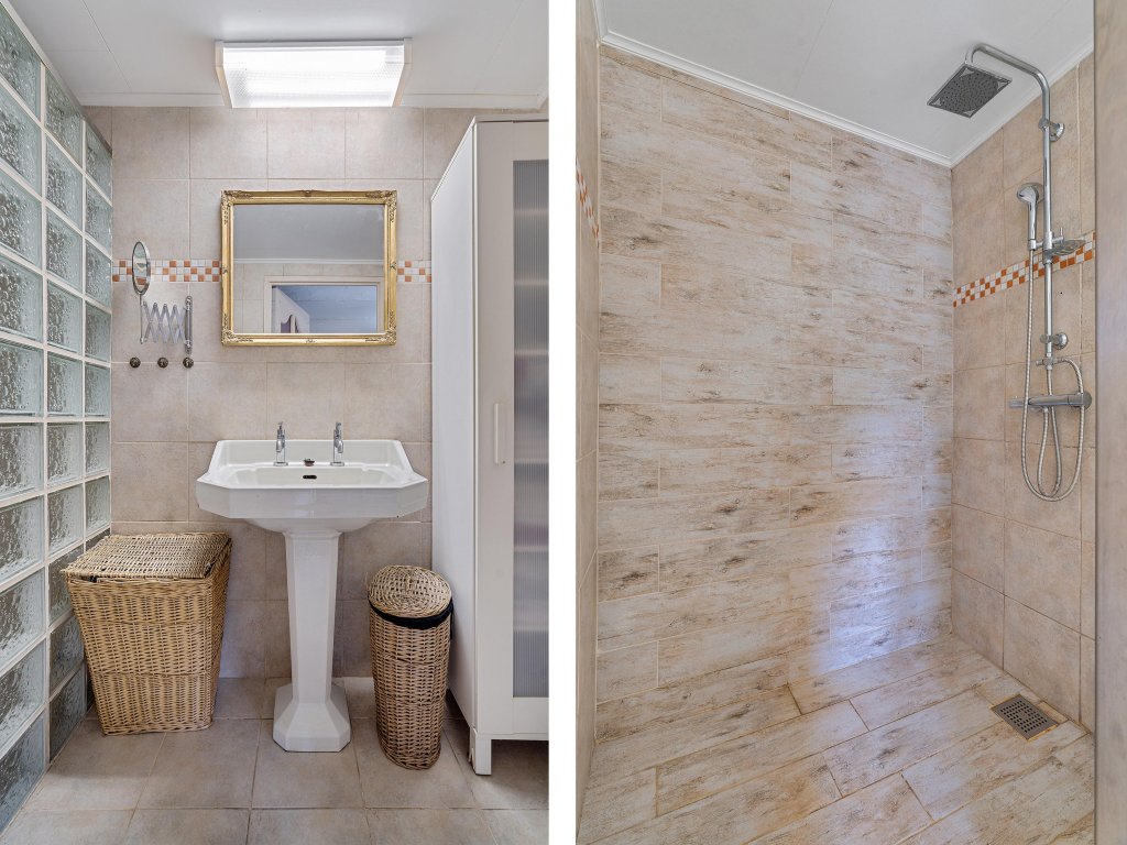 De volledig betegelde badkamer is uitgerust met een wastafel met dubbele kraan en een inloopdouche, die stijlvol wordt gescheiden door een glazen blokken wand.