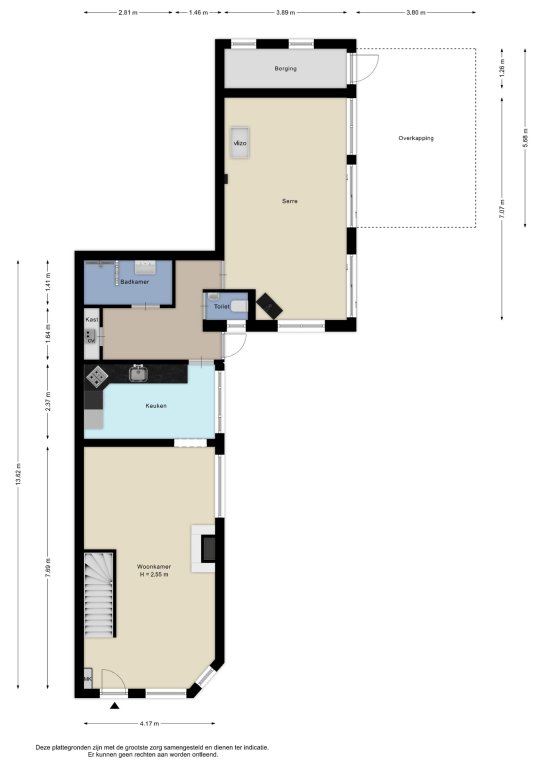 Alle door ons kantoor verstrekte informatie omtrent onroerende zaken, moet beschouwd worden als een uitnodiging om in onderhandeling te treden, en is geheel vrijblijvend! Alle vermelde maten en afmetingen zijn slechts bij benadering. Aan deze beperkte info kunnen geen rechten worden ontleend. Indien in enige documentatie of op enige website informatie staat die niet overeen komt met de werkelijkheid, dan geldt de feitelijke situatie waarin de woning zich bevindt, zoals koper deze tijdens de bezichtiging heeft kunnen waarnemen, en wordt de woning in deze feitelijke situatie/staat verkocht. Een (eventueel) bijgevoegde plattegrond dient uitsluitend als globale indicatie/visualisatie. Hieraan kunnen uitdrukkelijk geen rechten worden ontleend.