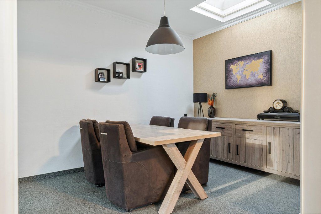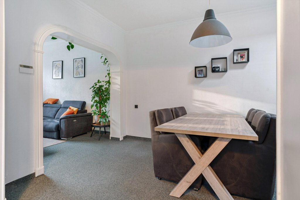 De woonkamer staat in open verbinding met de eetkamer, wat zorgt voor een fijne, lichte leefruimte met een prettige indeling. De grote boog tussen eetkamer en aanbouw geeft karakter en extra ruimtelijkheid.