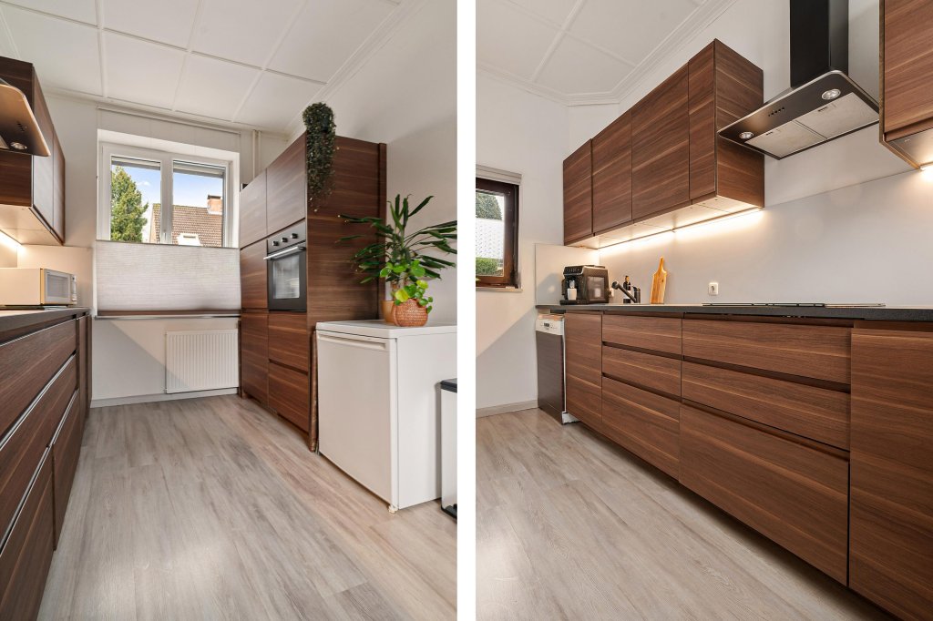 De gesloten keuken is voorzien van diverse inbouwapparatuur, waaronder een vaatwasser, inductiekookplaat, afzuigkap en spoelbak – ideaal voor kookliefhebbers.