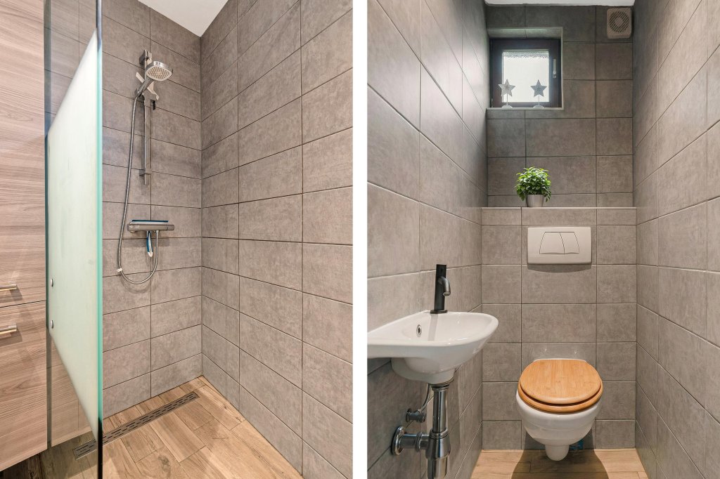 • Een geheel betegelde toiletruimte met hangcloset en fonteintje;
