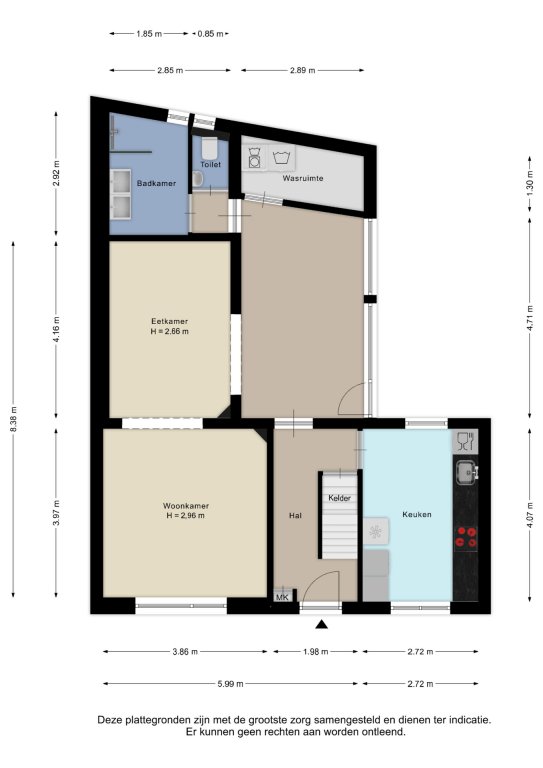 Alle door ons kantoor verstrekte informatie omtrent onroerende zaken, moet beschouwd worden als een uitnodiging om in onderhandeling te treden, en is geheel vrijblijvend! Alle vermelde maten en afmetingen zijn slechts bij benadering. Aan deze beperkte informatie kunnen geen rechten worden ontleend. Indien in enige documentatie of op enige website informatie staat die niet overeen komt met de werkelijkheid, dan geldt de feitelijke situatie waarin de woning zich bevindt, zoals koper deze tijdens de bezichtiging heeft kunnen waarnemen, en wordt de woning in deze feitelijke situatie/staat verkocht. Een (eventueel) bijgevoegde plattegrond dient uitsluitend als globale indicatie/visualisatie. Hieraan kunnen uitdrukkelijk geen rechten worden ontleend.