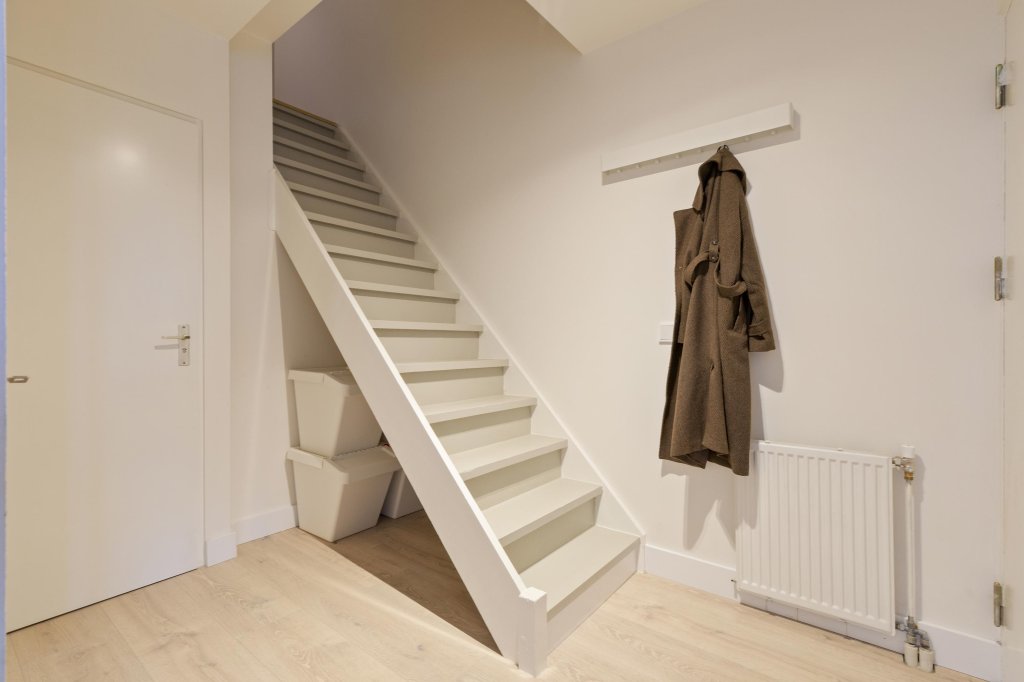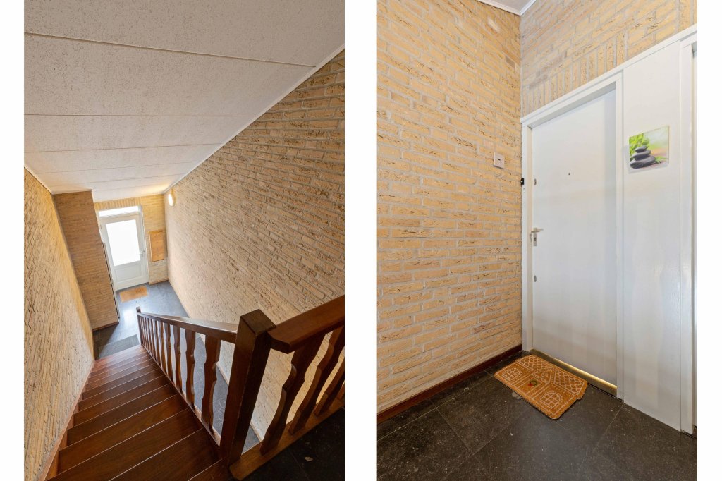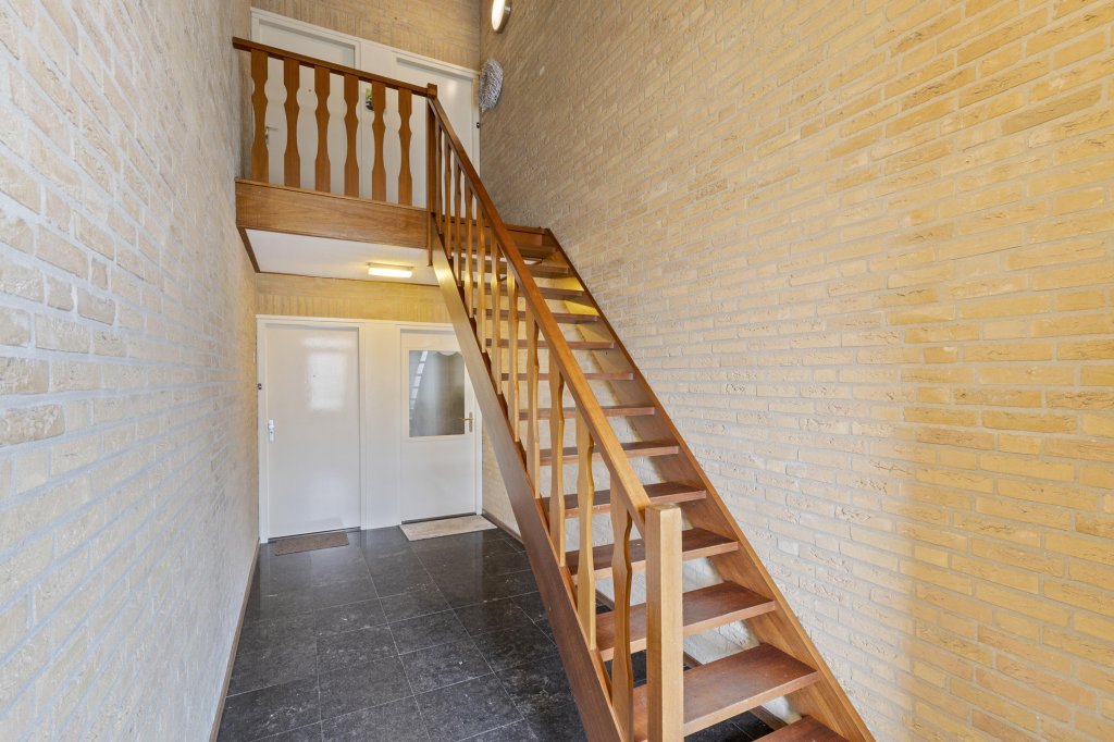 U komt binnen in de centrale entree met brievenbussen en trap naar de eerste verdieping.