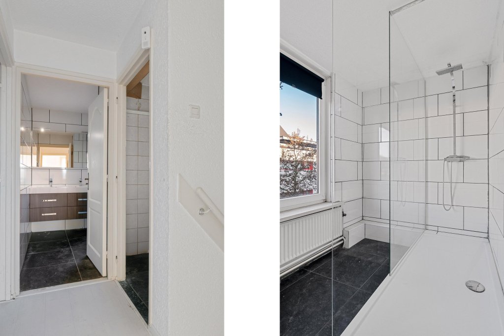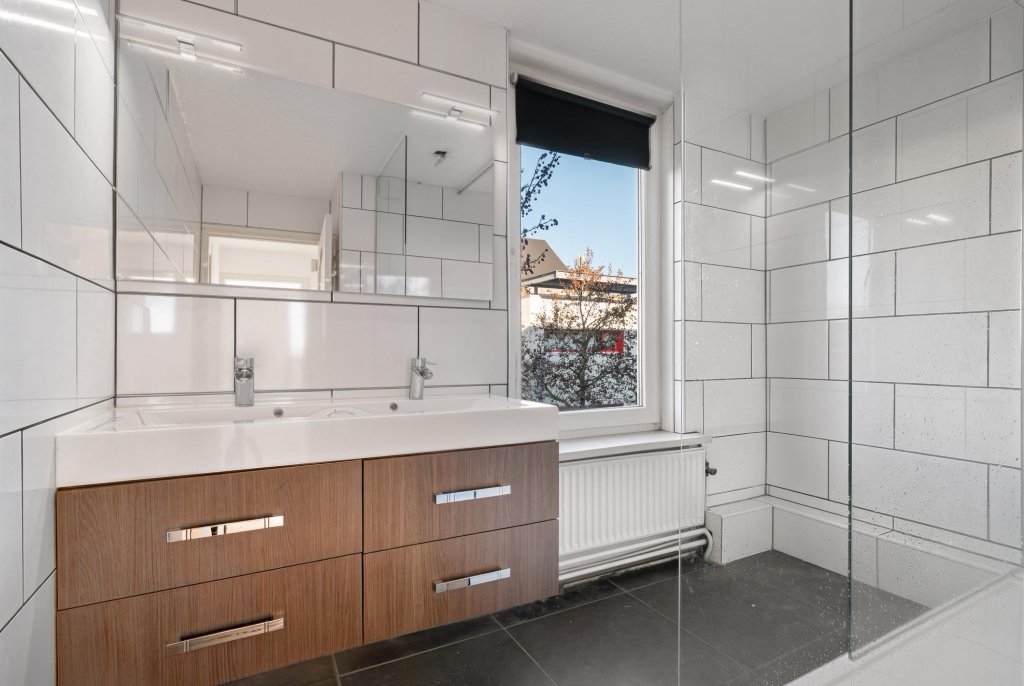 De geheel betegelde badkamer is uitgerust met een inloopdouche en een dubbele wastafel.