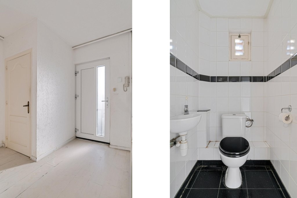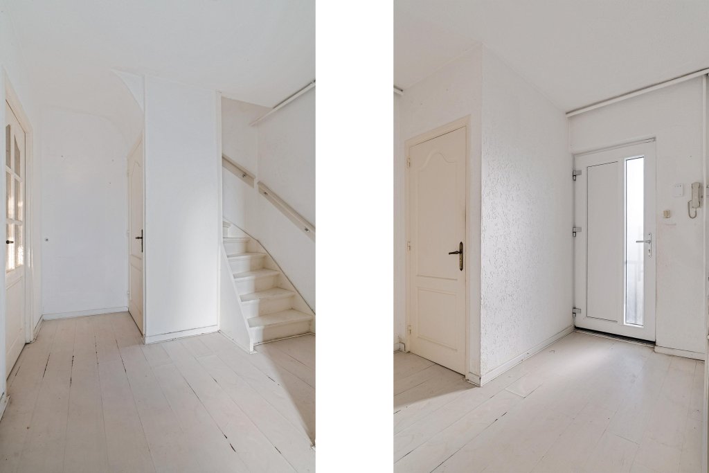U komt binnen in de hal met toiletruimte, voorzien van een staand toilet en fonteintje. De hal is afgewerkt met een houten plankenvloer en biedt toegang tot de trap naar de tweede verdieping. Onder de trap bevindt zich een praktische trapkast.