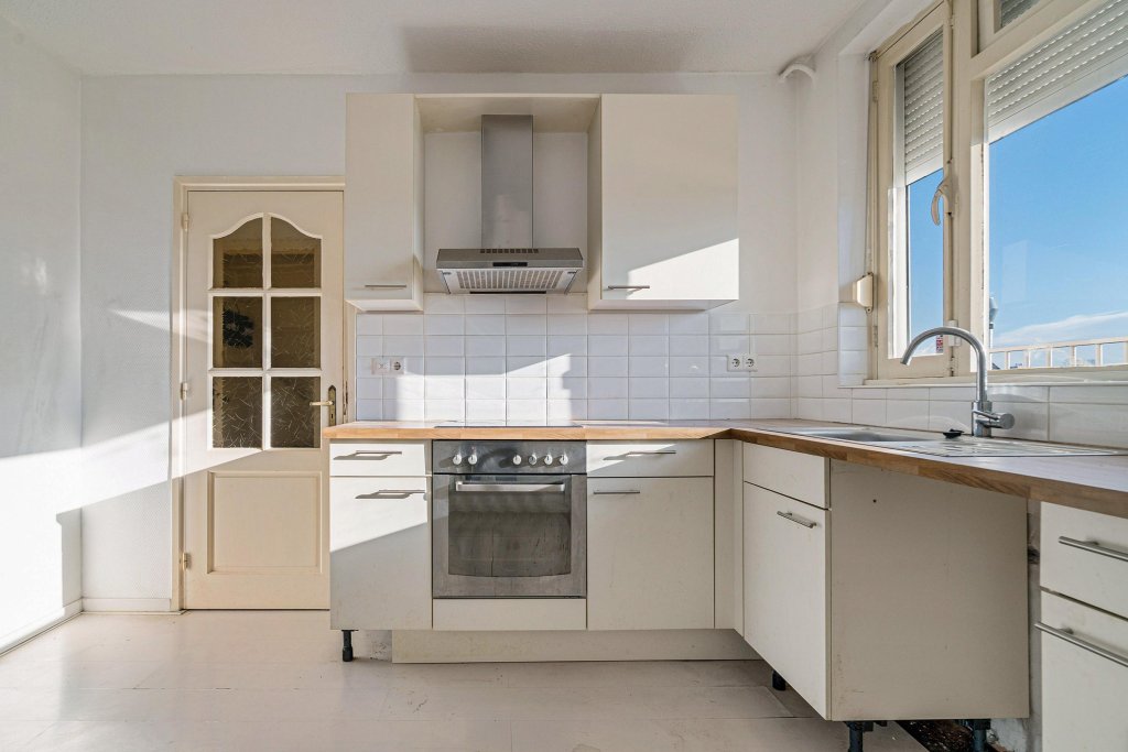 Aan de linkerzijde ligt de open keuken, uitgevoerd in een eenvoudige opstelling met spoelbak, oven, 4-pits inductiekookplaat, afzuigkap en zowel boven- als onderkasten. De keuken is voorzien van een handmatig rolluik.