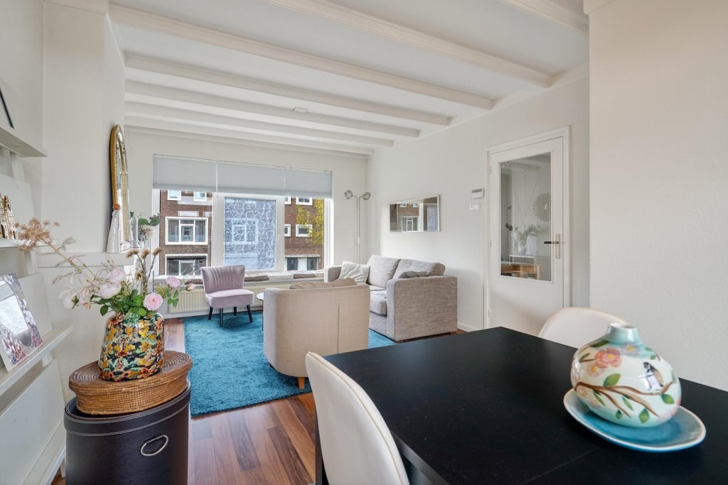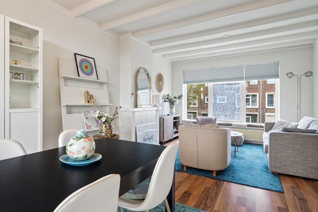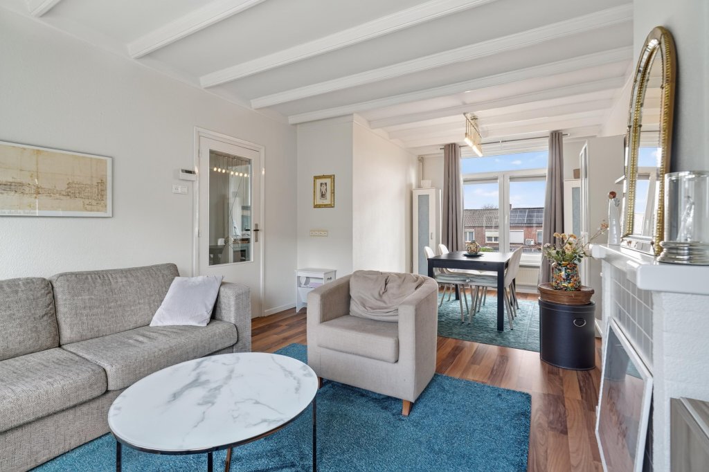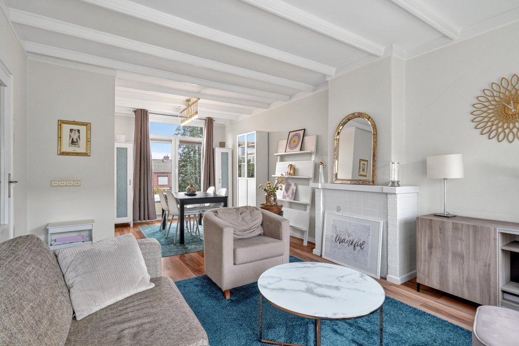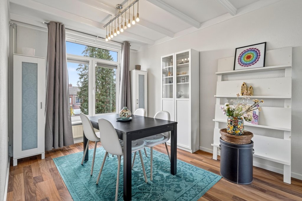 De doorzonwoonkamer met open eetkamer is een fijne leefruimte met grote ramen aan beide zijden, waardoor er veel licht binnenvalt. Dankzij de prettige indeling zijn zowel het zitgedeelte als de eetkamer ruim en uitnodigend. De laminaatvloer zorgt voor een warme uitstraling.
