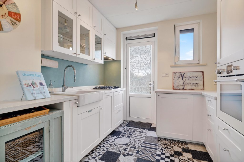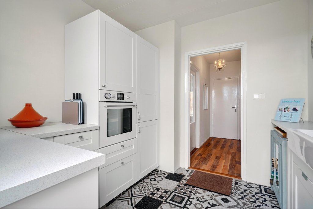 De gesloten keuken is praktisch ingericht met boven- en onderkastjes, een wasbak, vaatwasser, combi-oven, afzuigkap, 4-pits gasfornuis, koelkast en vriezer. Vanuit de keuken bereik je het balkon aan de achterzijde. De keuken is voorzien van een handmatig rolluik.