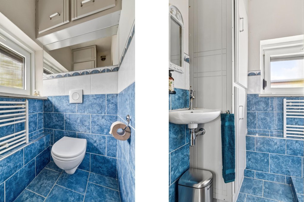 Het aparte toilet is half betegeld en voorzien van een fonteintje, kast, designradiator en extra opbergkastjes. Ook hier is een handmatig rolluik aanwezig.