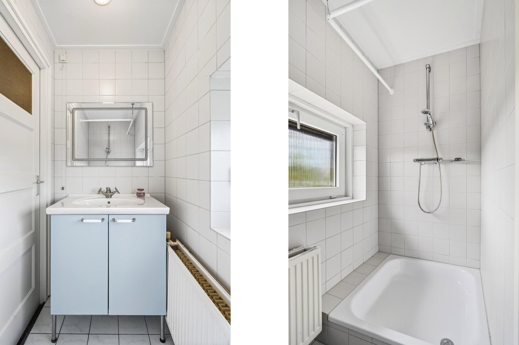 De badkamer is volledig betegeld en beschikt over een douche en een wastafel met badmeubel.