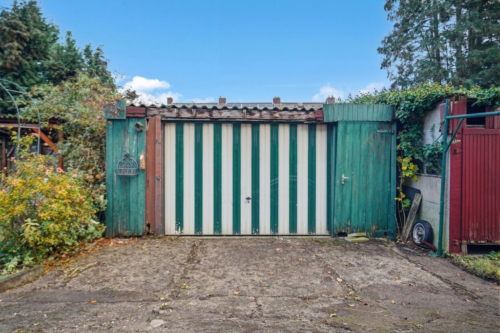 Aan de achterzijde van het complex bevindt zich het buitenterrein, waarbij je toegang hebt tot de grote berging en de eigen garage. Een waardevolle toevoeging voor extra opslagruimte of het veilig stallen van auto, motor of fietsen.
