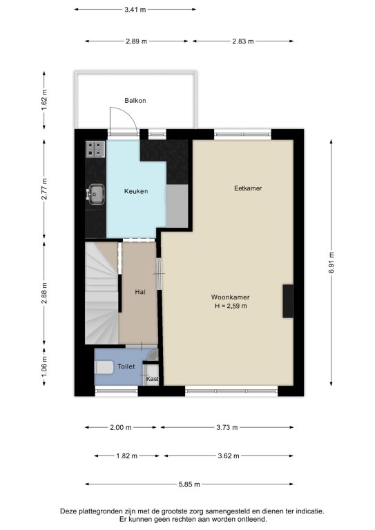 Alle door ons kantoor verstrekte informatie omtrent onroerende zaken, moet beschouwd worden als een uitnodiging om in onderhandeling te treden, en is geheel vrijblijvend! Alle vermelde maten en afmetingen zijn slechts bij benadering. Aan deze beperkte info kunnen geen rechten worden ontleend. Indien in enige documentatie of op enige website informatie staat die niet overeen komt met de werkelijkheid, dan geldt de feitelijke situatie waarin de woning zich bevindt, zoals koper deze tijdens de bezichtiging heeft kunnen waarnemen, en wordt de woning in deze feitelijke situatie/staat verkocht. Een (eventueel) bijgevoegde plattegrond dient uitsluitend als globale indicatie/visualisatie. Hieraan kunnen uitdrukkelijk geen rechten worden ontleend.