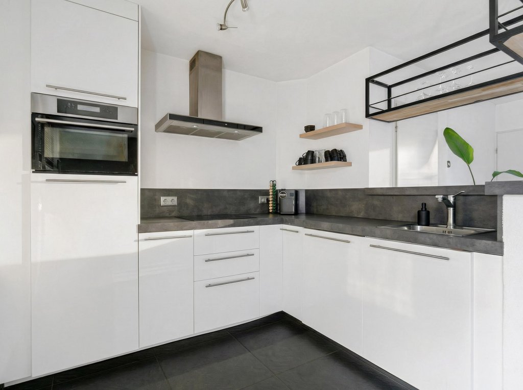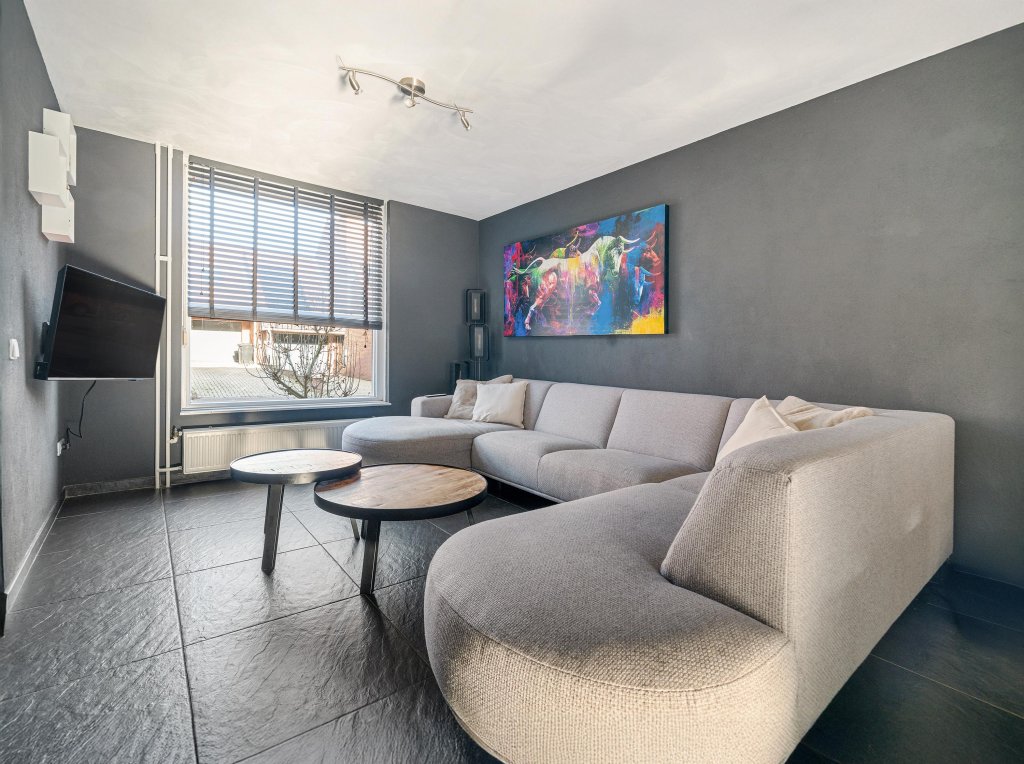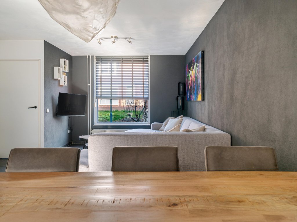 De woonkamer met doorlopende plavuizenvloer is ingericht met een woon en zitgedeelte en staat in open verbinding met de moderne keuken, die van alle gemakken is voorzien: Inductie, afzuigkap, vaatwasser, combi-oven en koelkast. De woonkamer is eveneens verbonden met de fraaie tuin met ruime overkapping en berging.