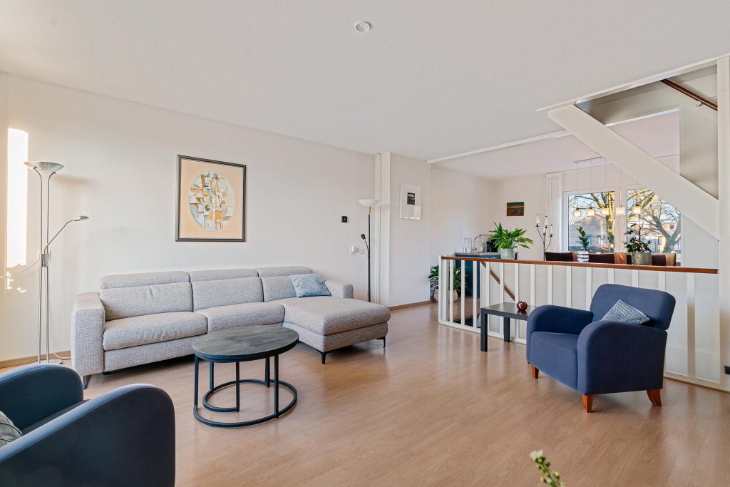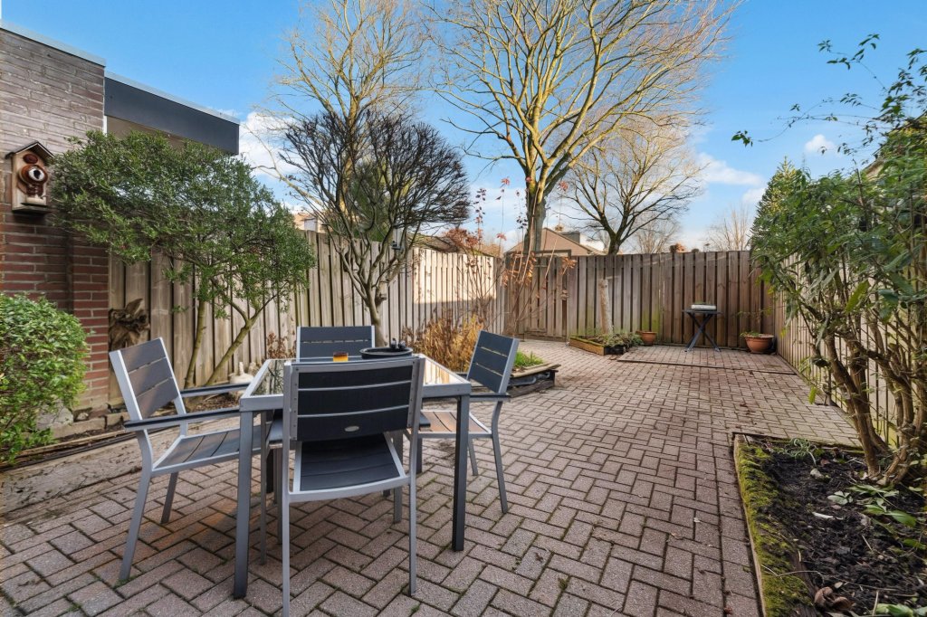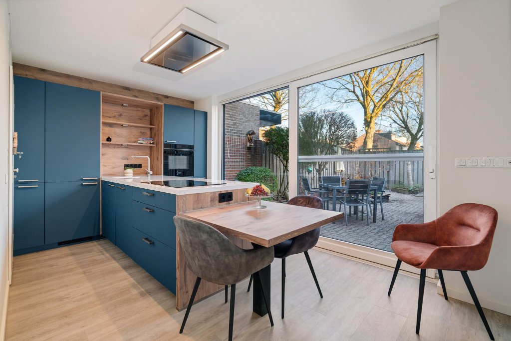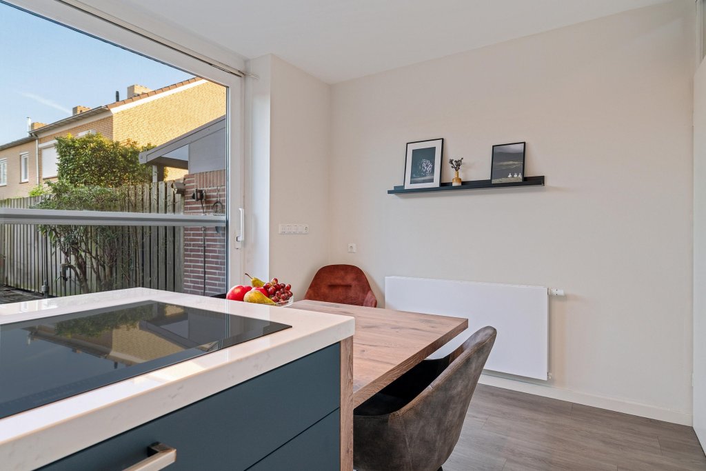 De begane grond vormt het hart van de woning met de royale leefkeuken (2023). Deze moderne keuken met schiereiland is uitgerust met hoogwaardige inbouwapparatuur, waaronder een inductiekookplaat met afzuiging, vaatwasser, koel-vriescombinatie en combi-oven. Daarnaast is in de keuken de c.v.-ketel geplaatst (eigendom). De grote schuifpui zorgt voor veel lichtinval en een directe verbinding met de fraai aangelegde achtertuin – een heerlijke plek voor lange avonden tafelen met familie en vrienden.