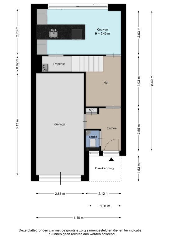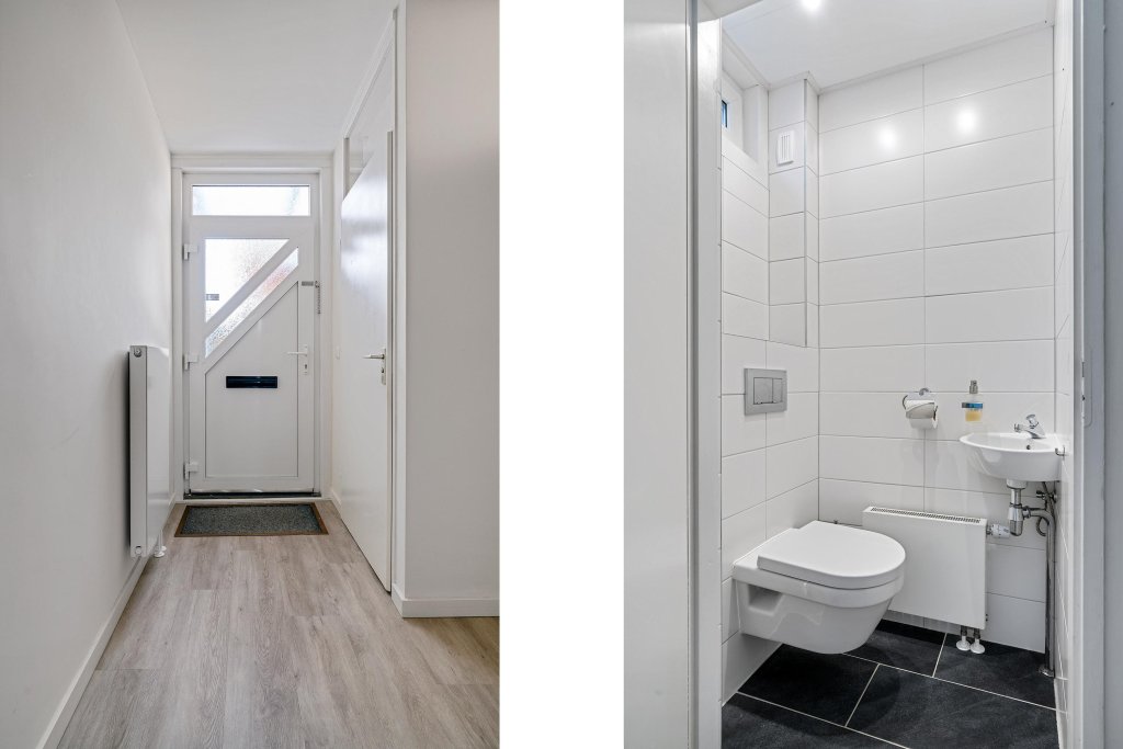 Via de nette voortuin en eigen oprit bereik je de woning. In de ontvangsthal tref je de meterkast en een modern toilet met zwevend closet en fonteintje. Vanuit hier is de inpandige garage bereikbaar, voorzien van witgoedaansluitingen en extra bergruimte.