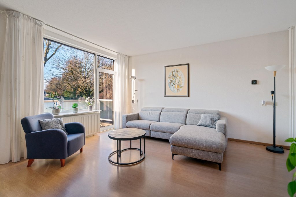 Op de eerste verdieping bevindt zich de ruime en lichte woonkamer. Grote raampartijen zorgen voor een prettige sfeer en een mooie lichtinval. Aan de voorzijde is een balkon aanwezig, ideaal om even buiten te zitten. De woonkamer beschikt bovendien over een praktisch keukenblokje met koelkast en wastafel, wat deze verdieping extra comfortabel maakt. Ook hier is de laminaatvloer stijlvol doorgetrokken.
