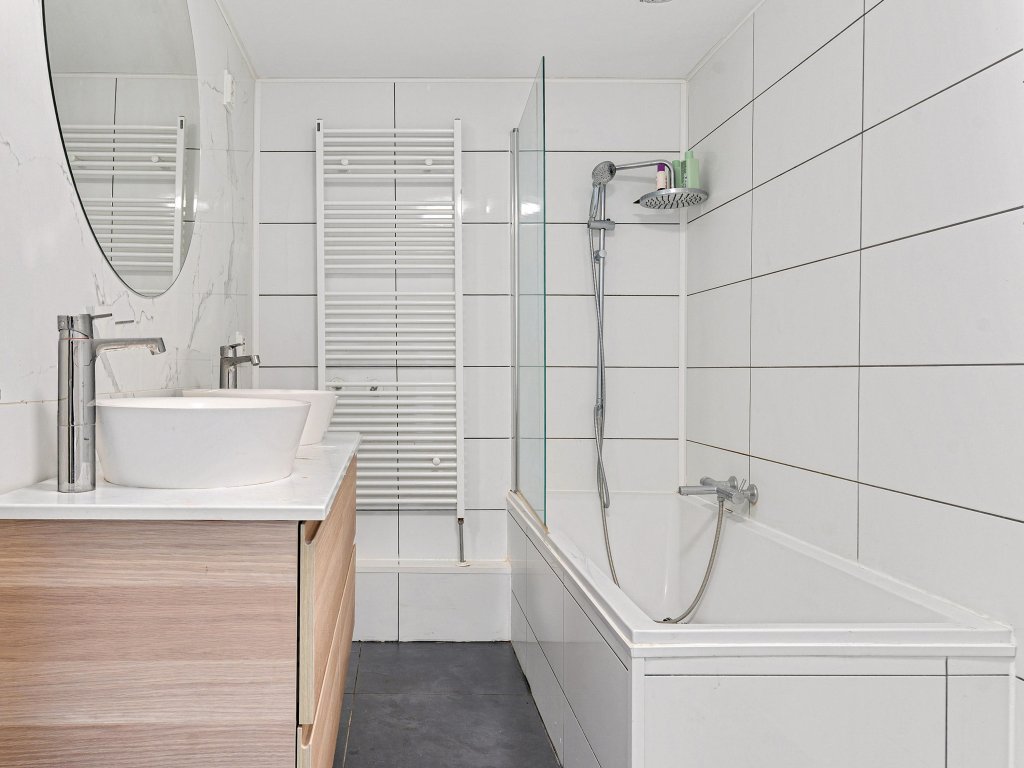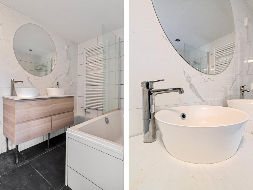 De badkamer is volledig betegeld en uitgerust met een ligbad met douchecombinatie en glazen wand, een dubbele wastafel met meubel en een designradiator. De drie slaapkamers zijn praktisch ingedeeld en netjes afgewerkt. Ook deze verdieping is voorzien van een laminaatvloer, wat zorgt voor een moderne en verzorgde uitstraling.