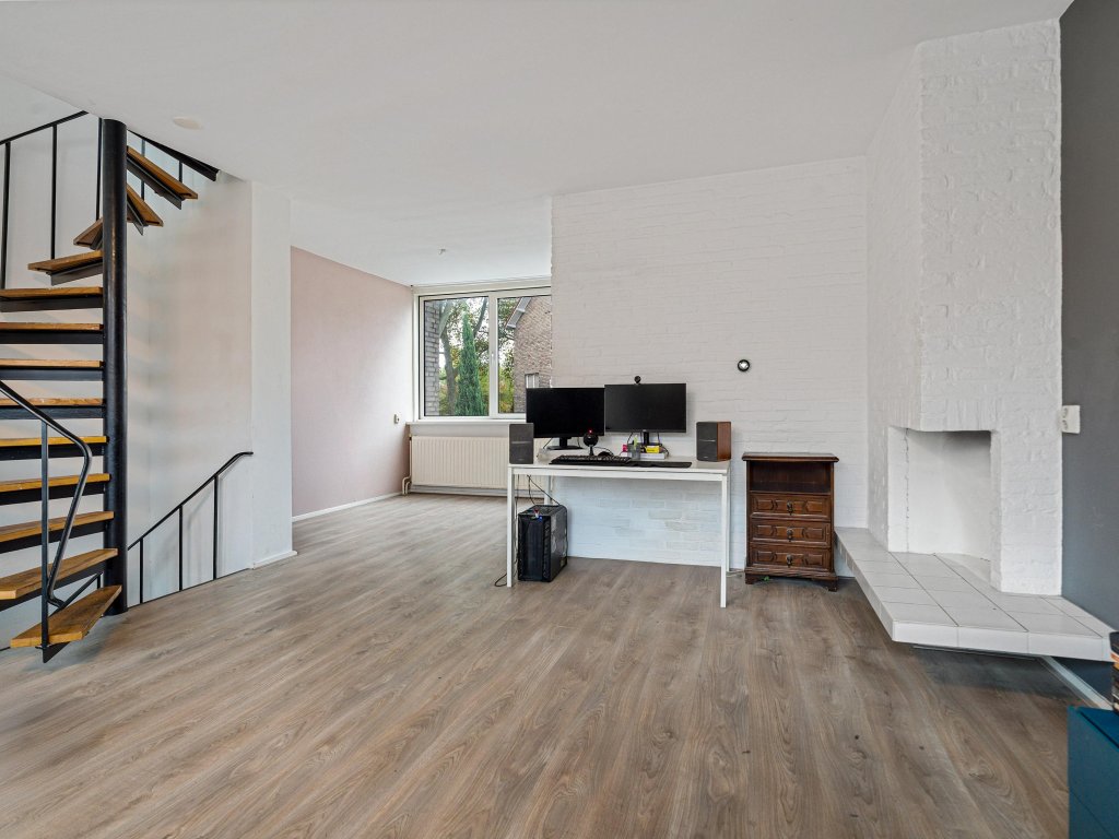 Via de wenteltrap kom je op de eerste verdieping, waar direct de lichte woonkamer in het oog springt. Dankzij de grote raampartijen geniet je hier van veel daglicht. De open haard zorgt voor extra sfeer tijdens koude dagen.