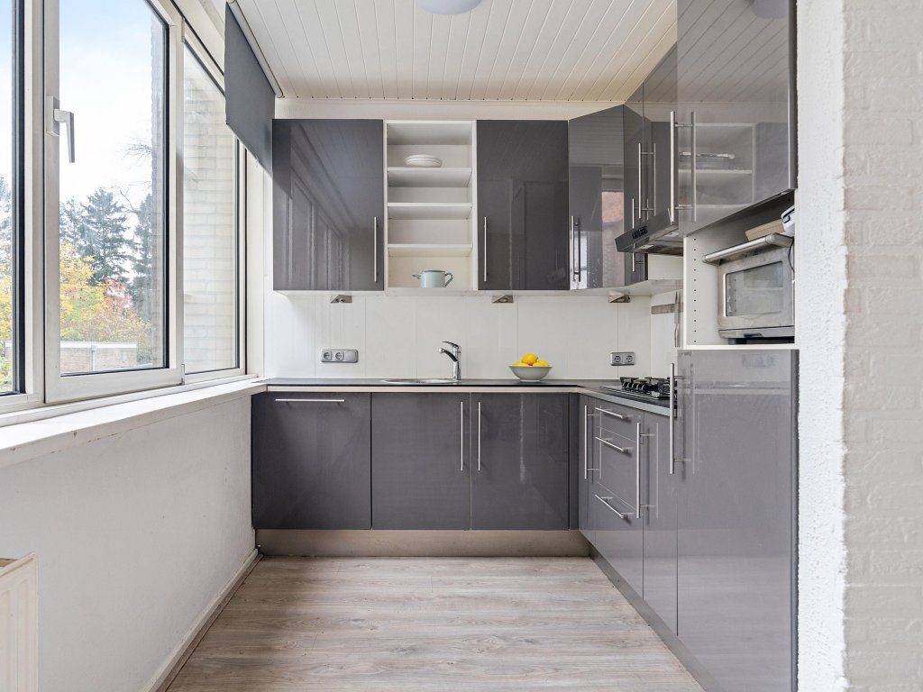De woonkamer staat in open verbinding met de keuken, die is uitgerust met boven- en onderkastjes, een vierpits gasfornuis, vaatwasser en koelkast. Vanuit de woonkamer is er tevens toegang tot het balkon. De gehele eerste verdieping is afgewerkt met een laminaatvloer.