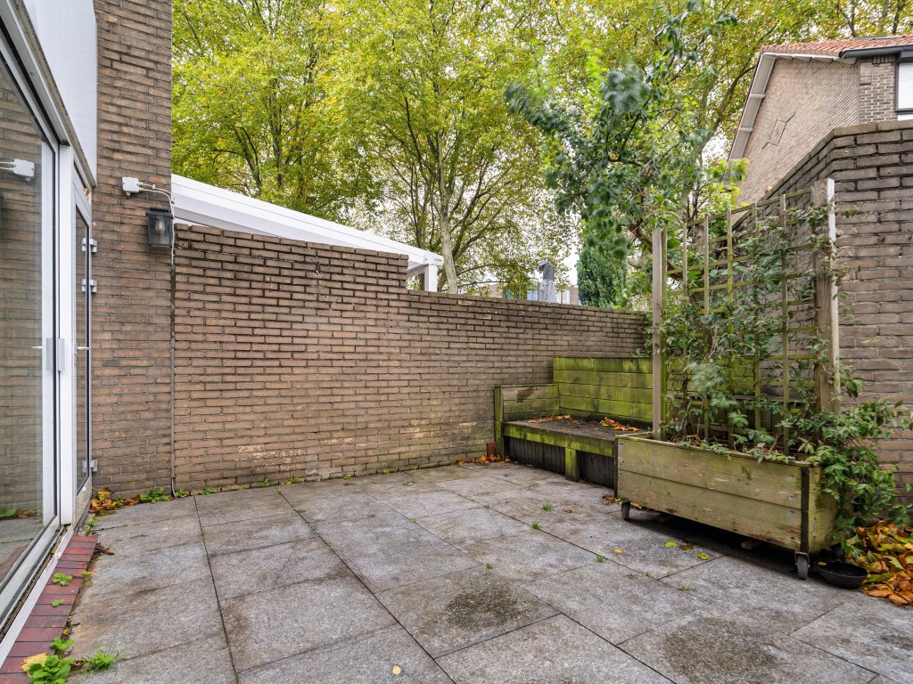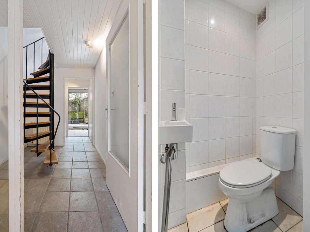 De hal leidt naar een tussenruimte met een volledig betegeld toilet met fonteintje en toegang tot de bijkeuken. In de bijkeuken bevindt zich de wasmachineaansluiting, een kast met de CV-ketel, en via de schuifdeuren bereik je de onderhoudsvriendelijke tuin. Deze tuin is betegeld en omsloten door een stenen omheining, wat zorgt voor veel privacy.
