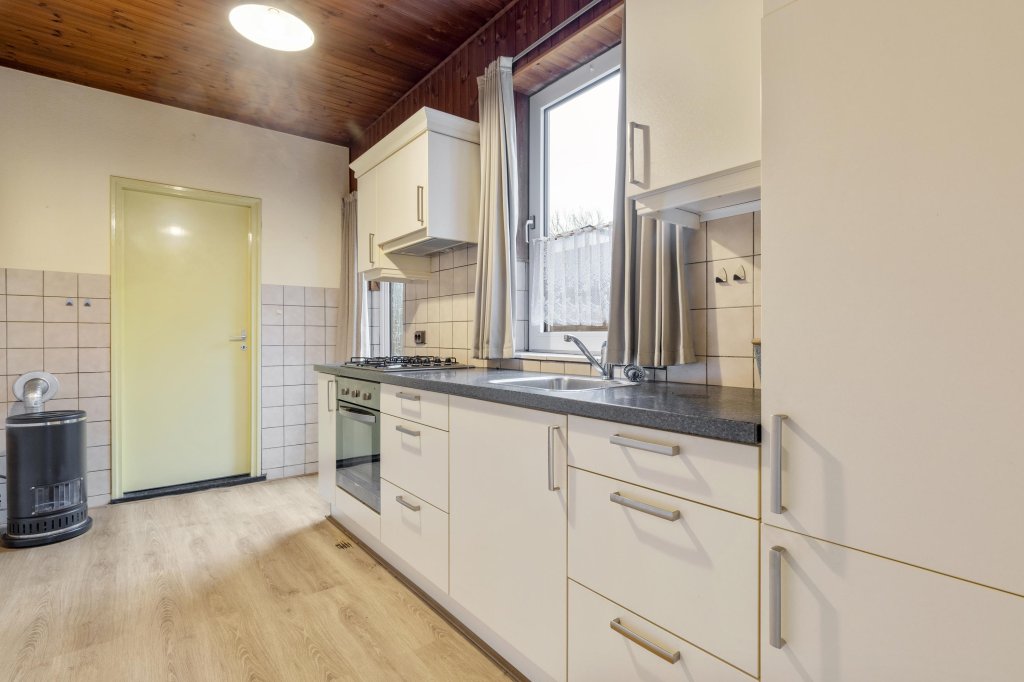 Ruime doorzonwoonkamer met toegang tot de gesloten keuken. De keuken is voorzien van de navolgende inbouwapparatuur: 4 pits gaskookplaat en afzuigkap. Via de keuken is er toegang naar de toiletruimte, de badkamer en berging.